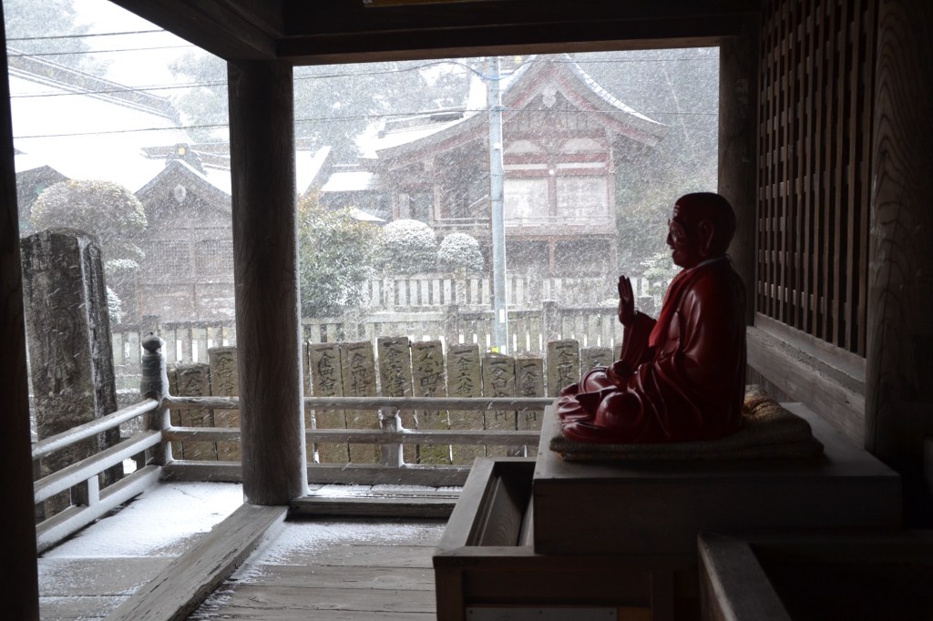 Op de top van de berg staat een standbeeld van Kobo Daishi, het doemde in de sneeuwbui op.