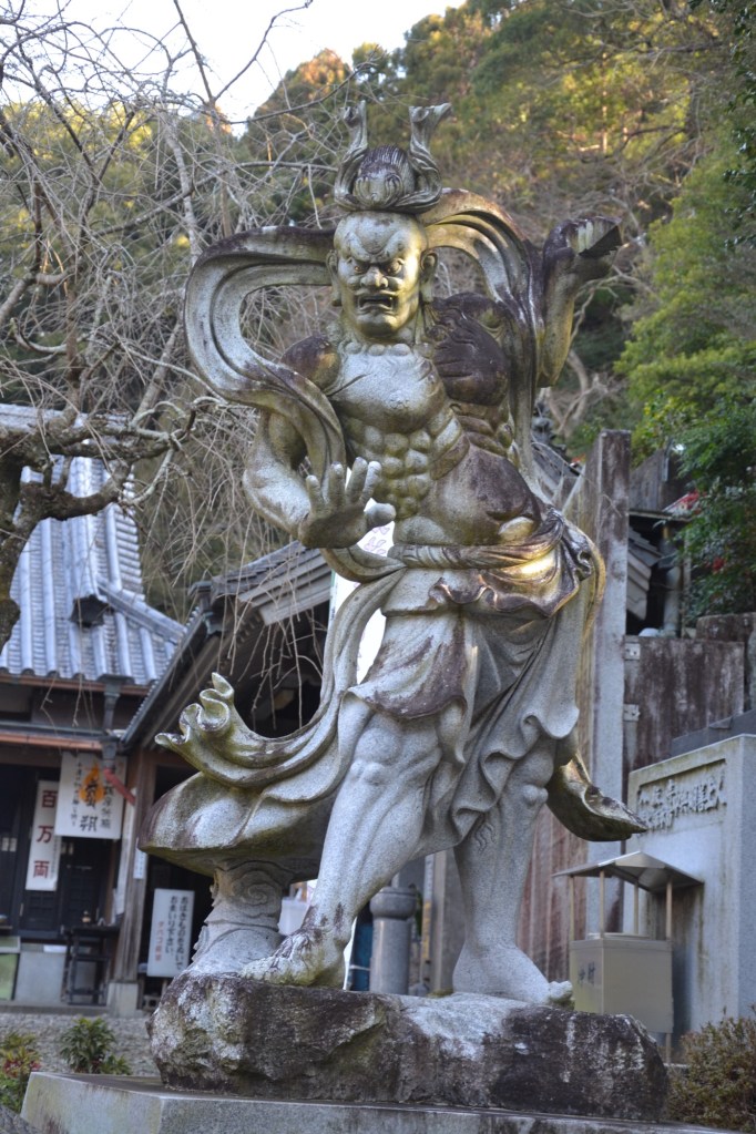 Meestal aan de zijkanten in de toegangspoort van een tempel staan twee tempelwachters. Bij de tempel waar ik vandaag langs liep was geen poort, maar wel de wachters.