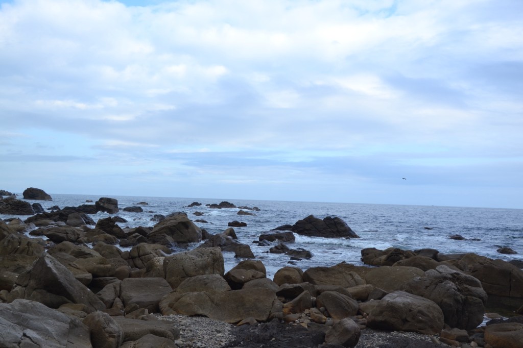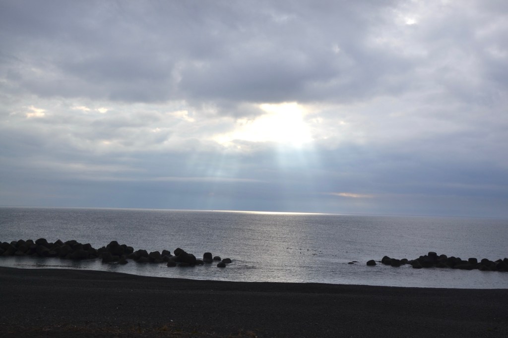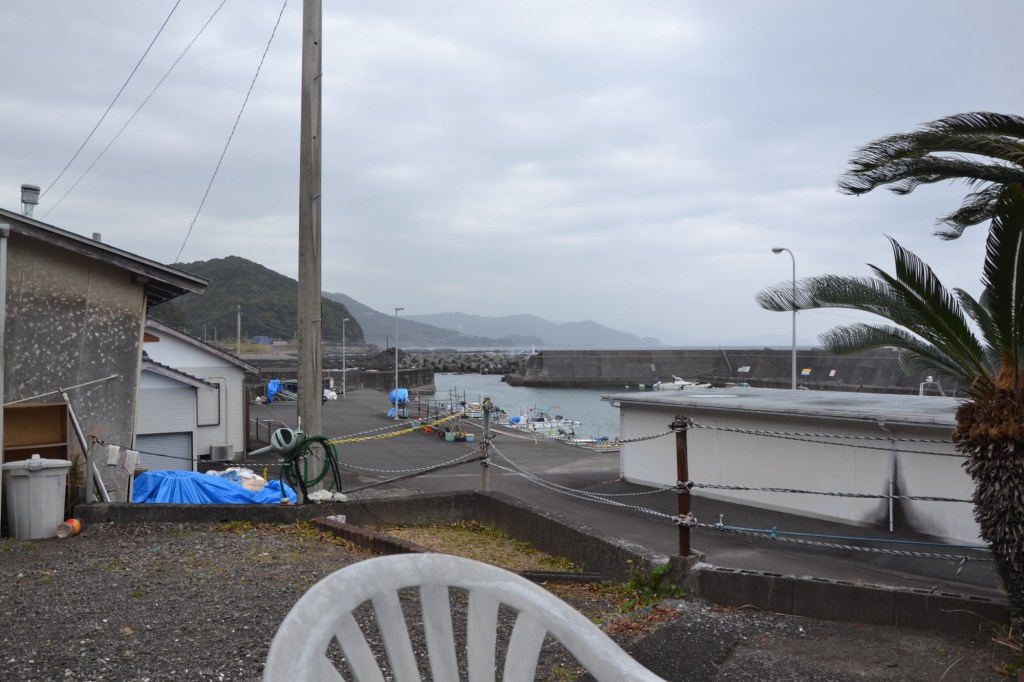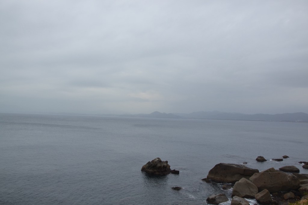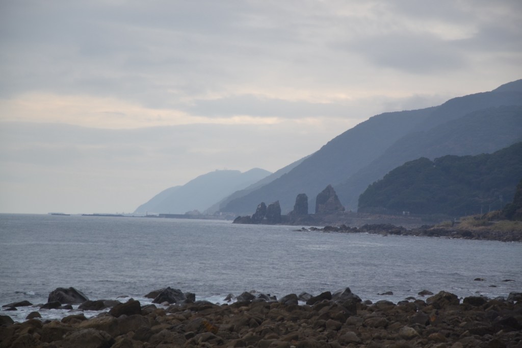 Zo’n hele dag lopen langs de snelweg, het klinkt niet echt aantrekkelijk, maar voor een keer is er veel te zien. En, de weg gaat langs de oceaan, altijd mooi. Het was zondagochtend vroeg niet druk. ik wilde ongeveer 22 km lopen en de man van de minshuku zei me dat er gedurende de eerste 17 km niets was, qua huizen, winkels enz. Hij gaf me sinaasappels en water mee. Het was vandaag bewolkt en 18 graden, het was niet duidelijk of het zou gaan regenen en hoe hard. Ik gokte het erop, liet mijn regenkleding in de rugzak.