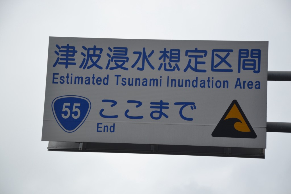 Dit gedeelte van de kust is tsunami gebied. Om de 25 m staat een bord met een pijl waar naar toe (de berg op) te rennen als er alarm klinkt.