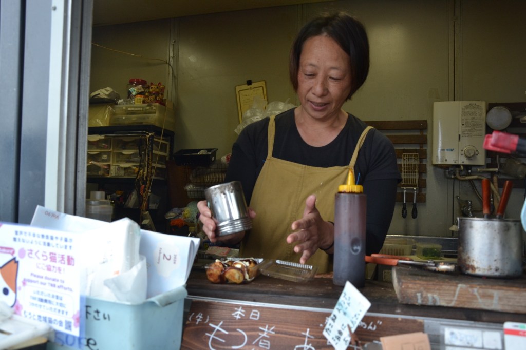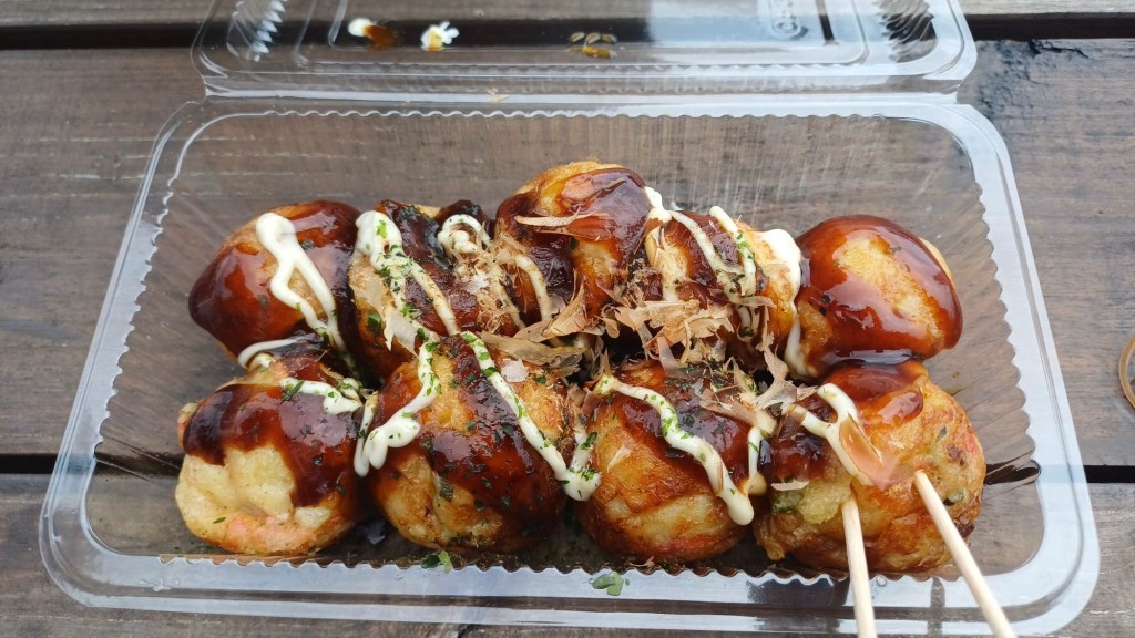 Na die 17 km was dit natuurlijk zeer welkom! Heerlijk! Japans streetfood: balletjes gevuld met octopus, gember en bosui.