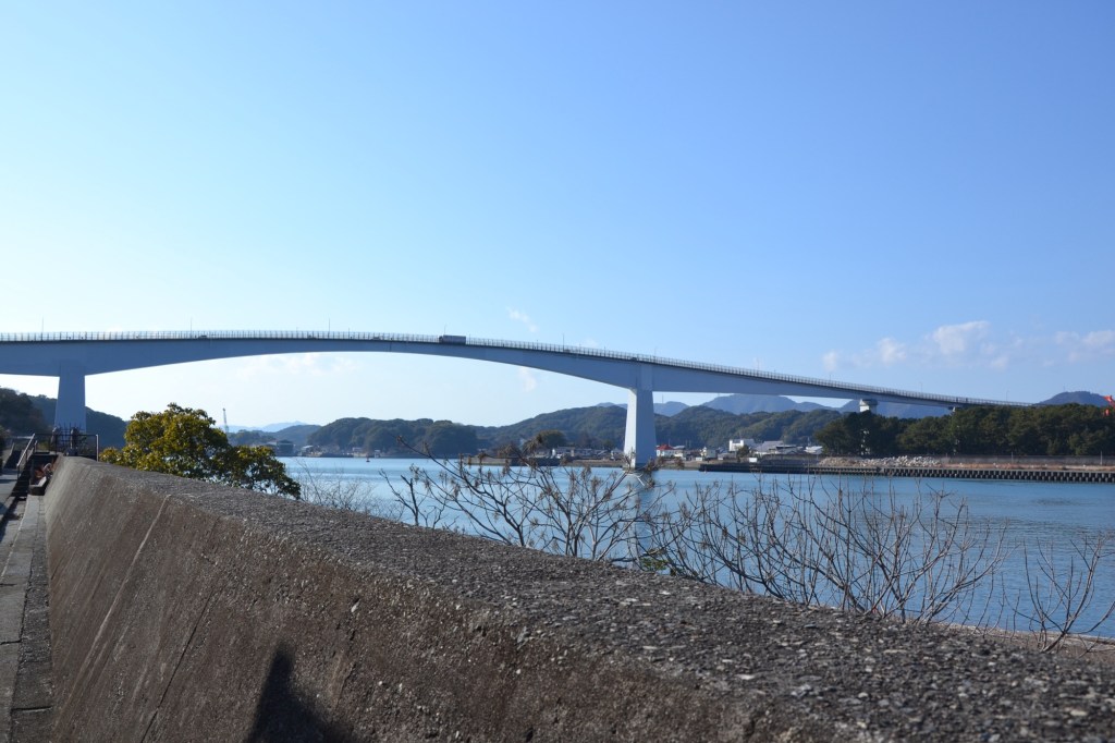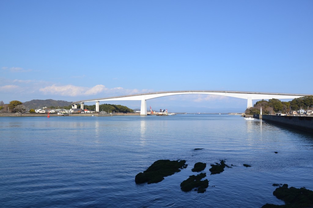 Tenslotte moest ik met een veerpont naar de overkant van een enorme inham. Toen ik bij de aanlegsteiger van de veerpont aan kwam bleek deze niet te gaan. Ik moest een stuk omlopen (altijd fijn op het einde van een dag) naar een enorme brug. Een vrouw op een fiets zag me teruglopen en ging snel een drankje voor me kopen: ‘energy’, op het pakje stond: met dezelfde waarde aan koolhydraten als een rijstbal! (Het was duidelijk een Japans energy drankje). Vanaf de brug had ik prachtige uitzichten, (foto’s maken ging moeilijk), maar het zicht op de brug is ook imponerend.