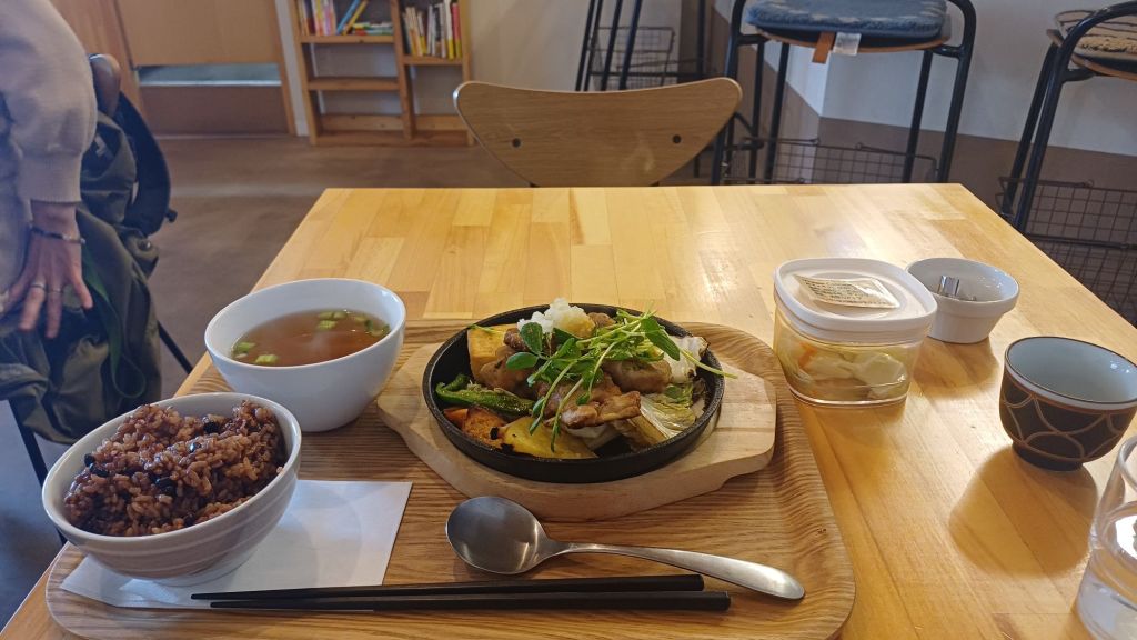 Daar ‘mocht’ ik alleen binnenkomen als ik mijn natte regenkleren buiten aan de overdekte waslijn hing. Daar zat ook een enorm dikke kat. Een ‘obesitas neko’ (obesitas kat) zei ik tegen de eigenaar die met zijn armen vol met spullen van mij stond (camera, bril, telefoon, handtas) te wachten tot ik mijn regenbroek uit kreeg. Hij begreep het niet, of wilde het niet begrijpen…