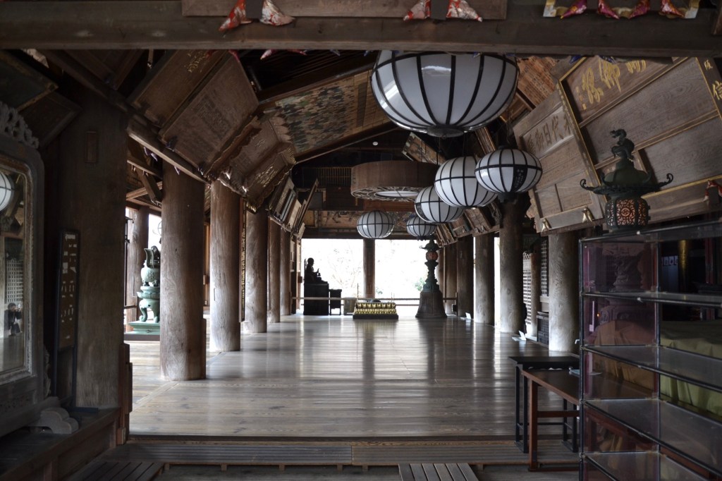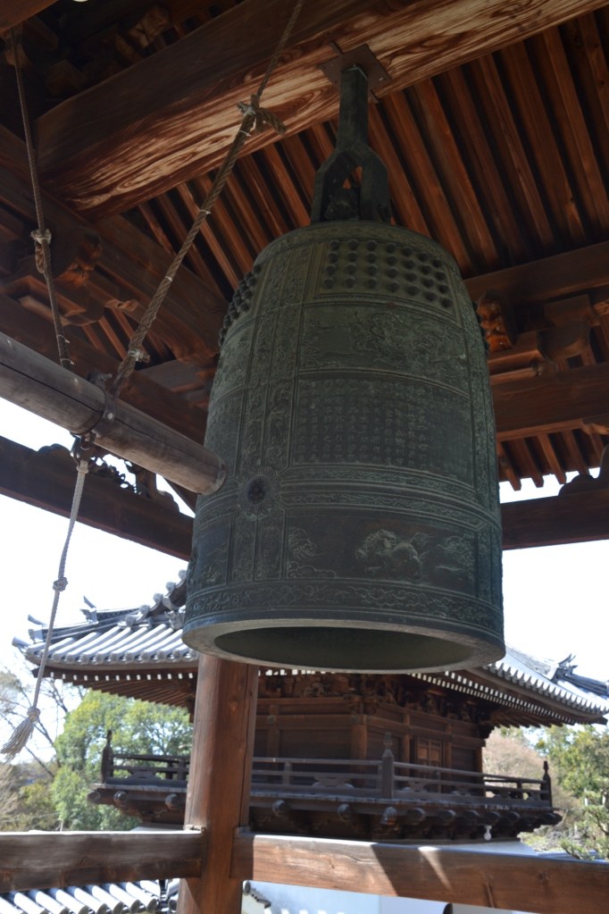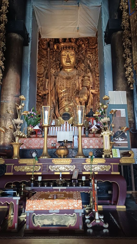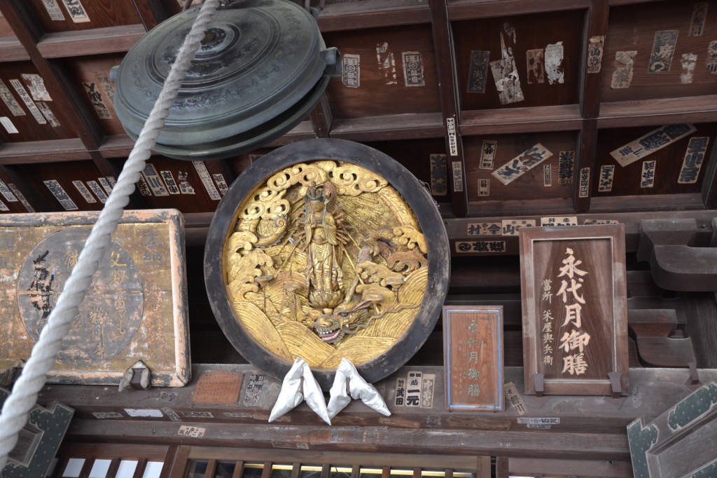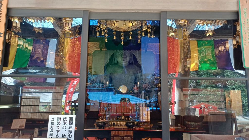 De tempel is gewijd aan Senjū Kannon, maar wij gewone stervelingen mogen, kunnen haar niet zien. Boven de ingang van de hal hangt slechts een goudkleurig plakkaat met haar afbeelding. Maar wel vlakbij de bel, zodat ze altijd hoort wie er bij haar ‘aanklopt’.