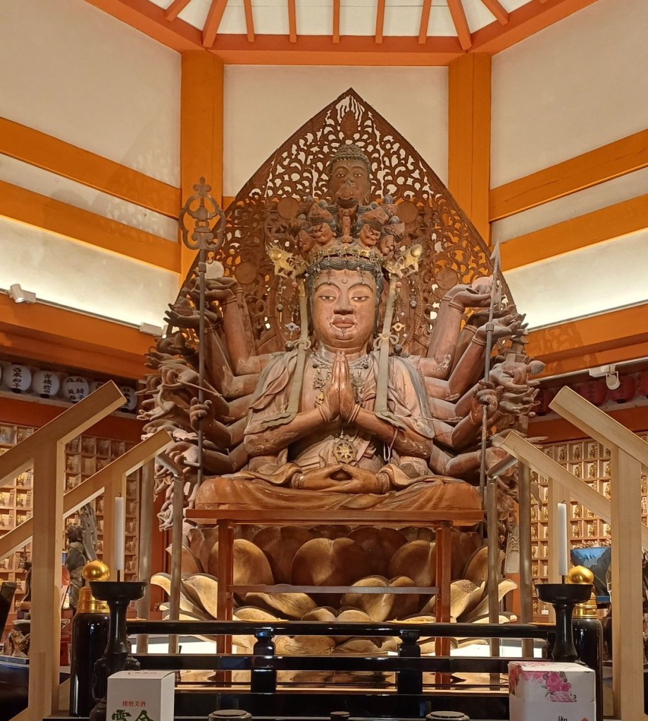 Deze Kannon heeft veel armen (met daarin alle attributen, symbolen van het Boeddhisme) en 11 hoofden + een ‘derde oog’. Allemaal om de lijdenden te kunnen helpen. Het is echter niet de Kannon waar deze tempel aan is gewijd.
