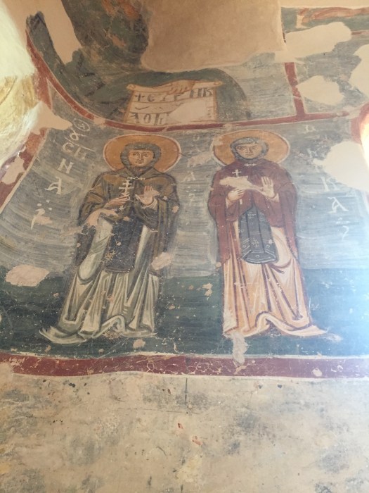 Alle muren zijn bedekt met prachtige afbeeldingen van verhalen uit de bijbel, heiligen, prinsen en prinsessen. Het zijn fresco’s direct op de muren geschilderd. De afbeelding is vaak een icoon. Maar in tegenstelling tot andere iconen zijn deze schilderingen speelser, zijn de mensen levend(ig), zijn ze niet zo schematisch en ‘strak’.