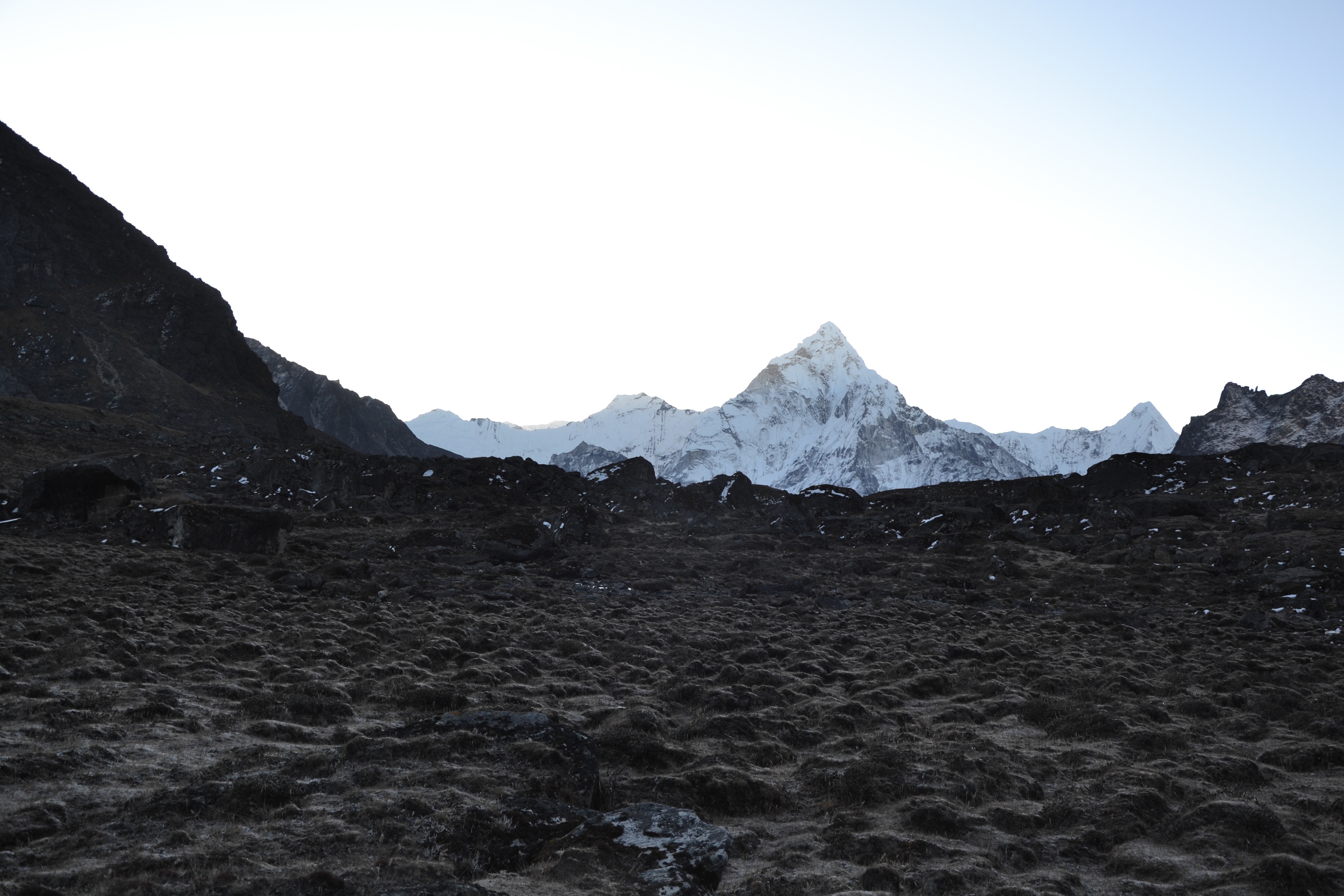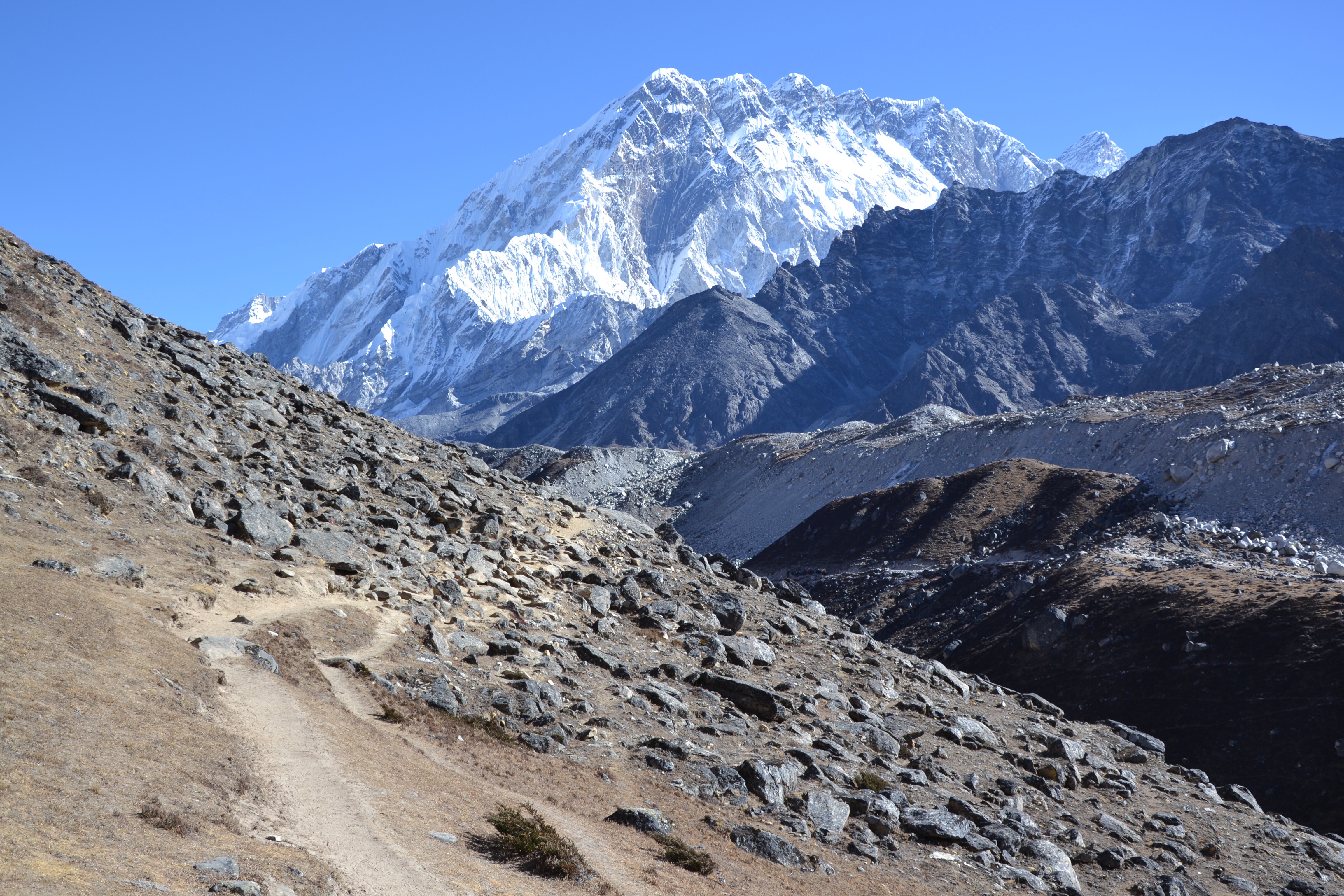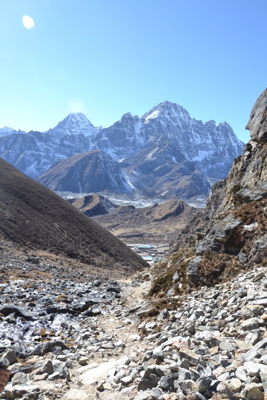 Ik ben weer opgeknapt (voorzover je daarvan kunt spreken op 5000 meter hoogte), de groep is doodmoe (waarvan 2 geheel kapot) gistermiddag teruggekeerd en we gaan weer verder, op weg naar de lodge onderaan de pas.