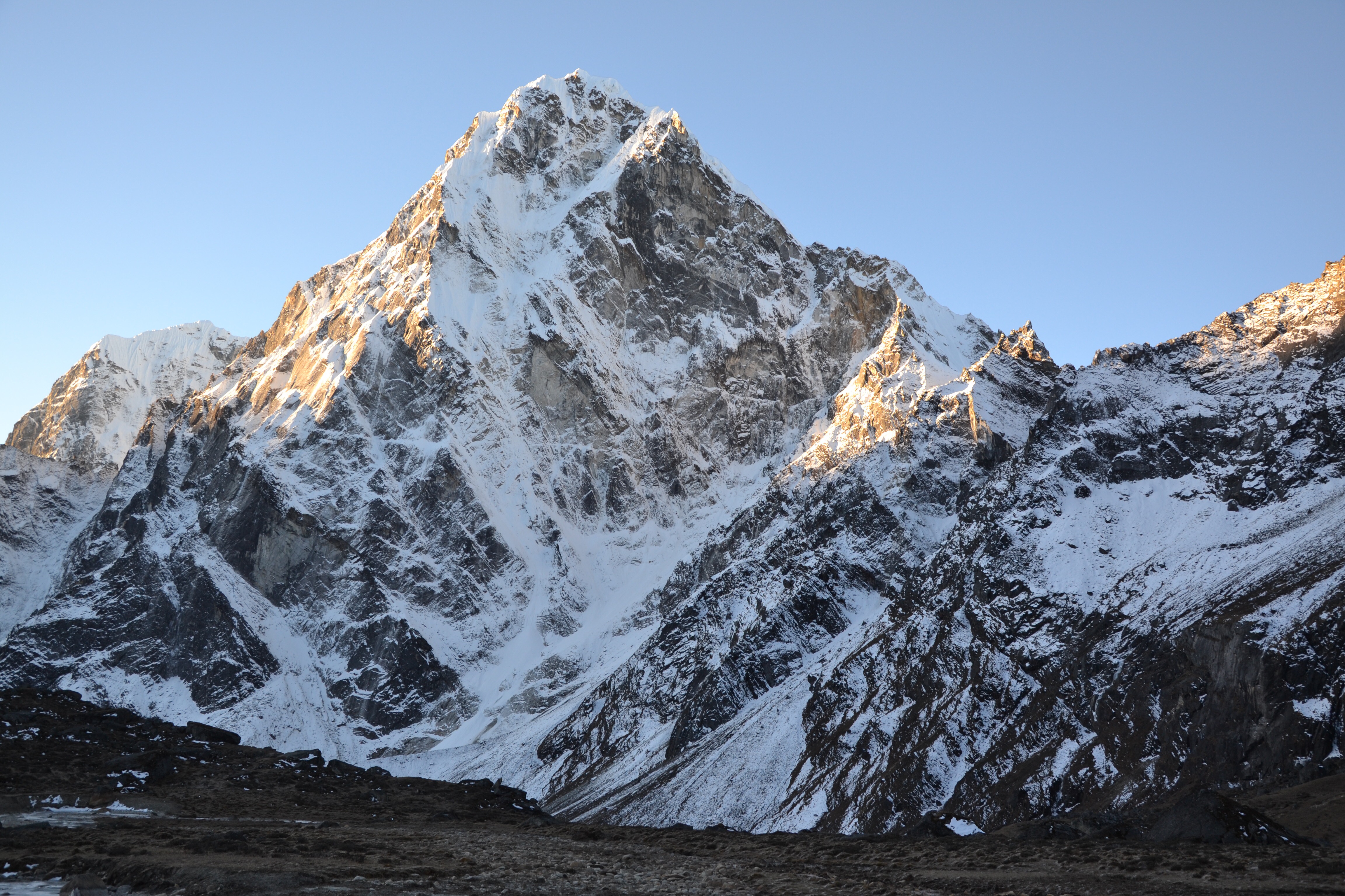 Daarna gaat de tocht verder alweer een prachtig dal in, nu naar beneden, weer via rotsen-ijs-sneeuw. Langs een enorme sneeuwwand met stenen. We moeten hier voorbij zijn voordat de zon erop gaat schijnen, want dan gaat het dooien en kunnen er stenen wellicht op ons vallen. Dus ook nog doorlopen……