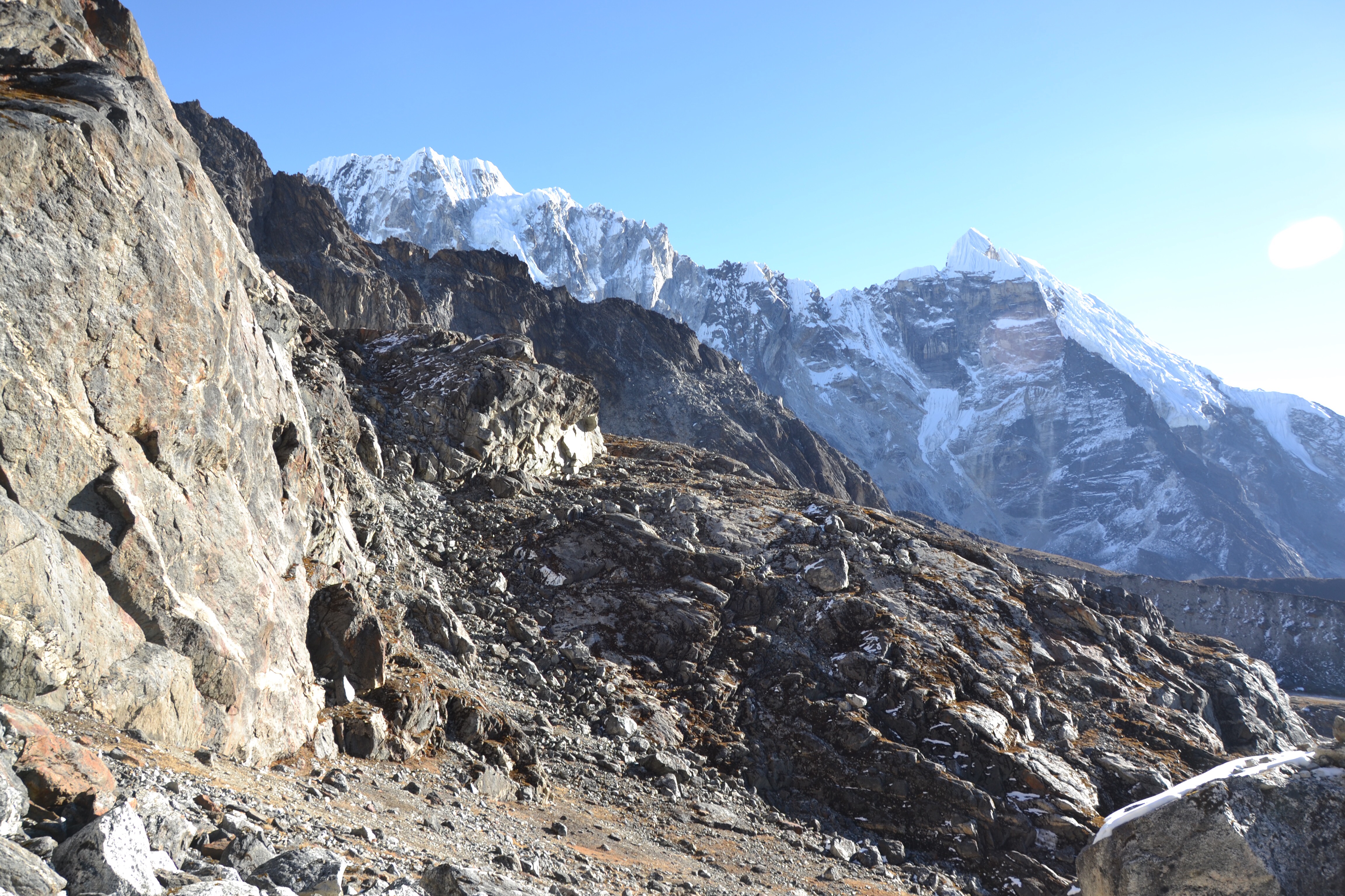 Onze tocht gaat eerst over een ‘pad’ met stenen, dit ‘pad’ verdwijnt en de stenen worden groter. Uiteindelijk wordt het met handen en voeten omhoog klimmen. ‘Boven’ gaat het links om de hoek en wordt het klimmen via rotsen met ijs. Tenslotte bereiken we een gletsjer die moet worden overgestoken.