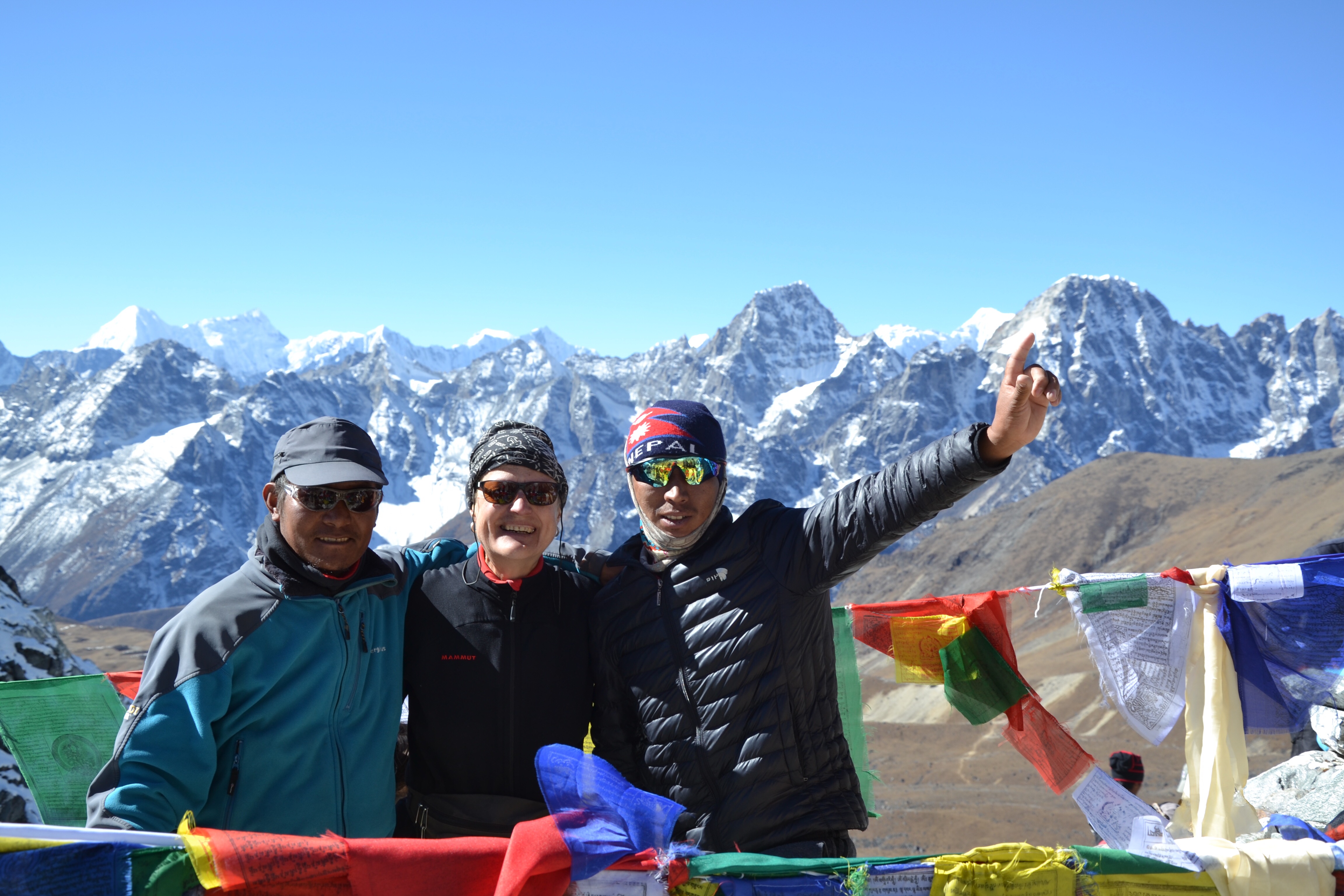 Als we de gletsjer over zijn komt een laatste klim over rots-sneeuw-ijs omhoog naar de pas, waar de gebedsvlaggen wapperen. Daar krijgen we een kwartier om uit te rusten en foto’s te maken.