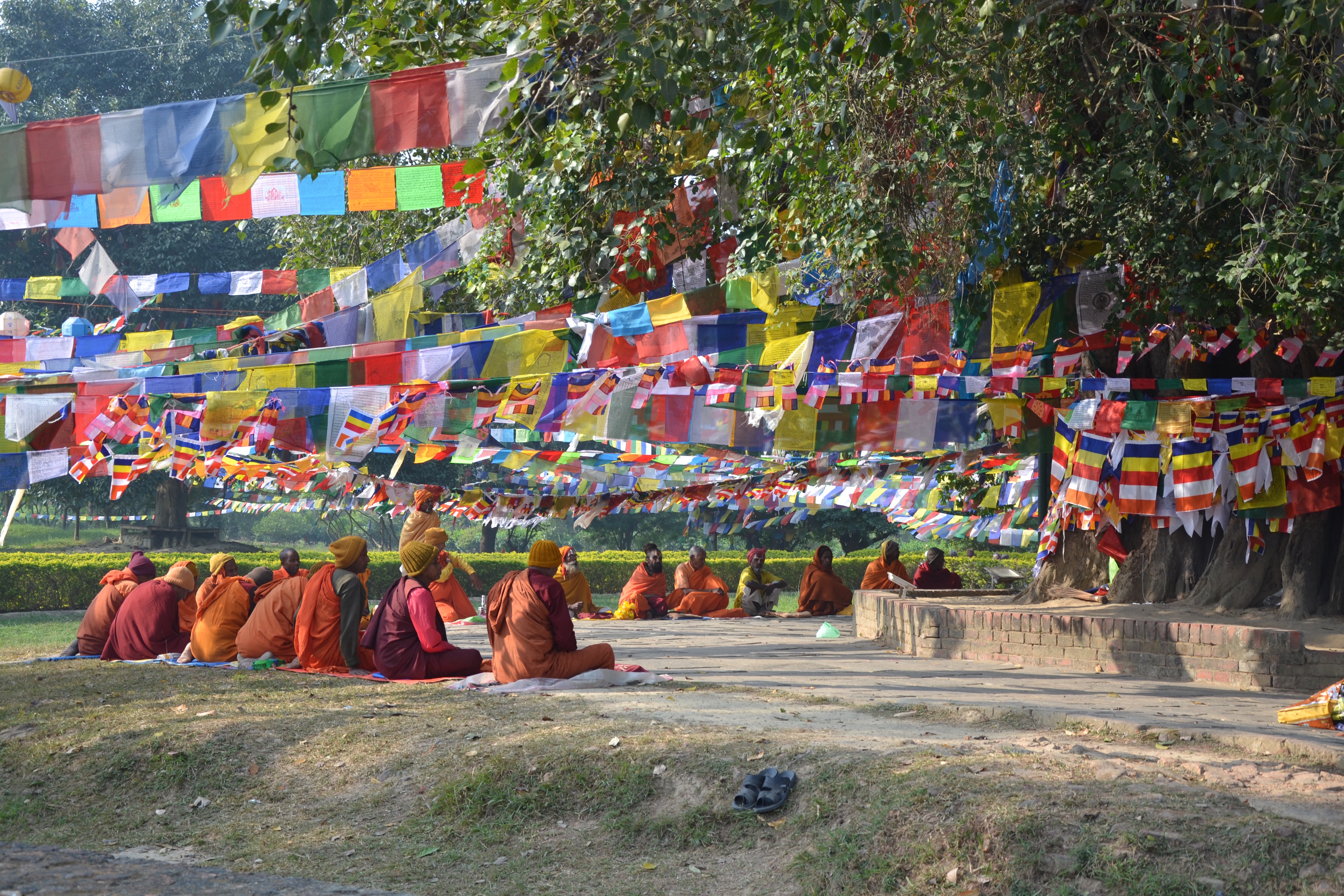 Via de uitgang van de tempel kom je op een grote plaats met bodibomen. Deze zijn allemaal met elkaar verbonden door een zee van gebedsvlaggen. Tot mijn verbazing zat er rond de grootste bodiboom een kring van hindoe saddu’s.