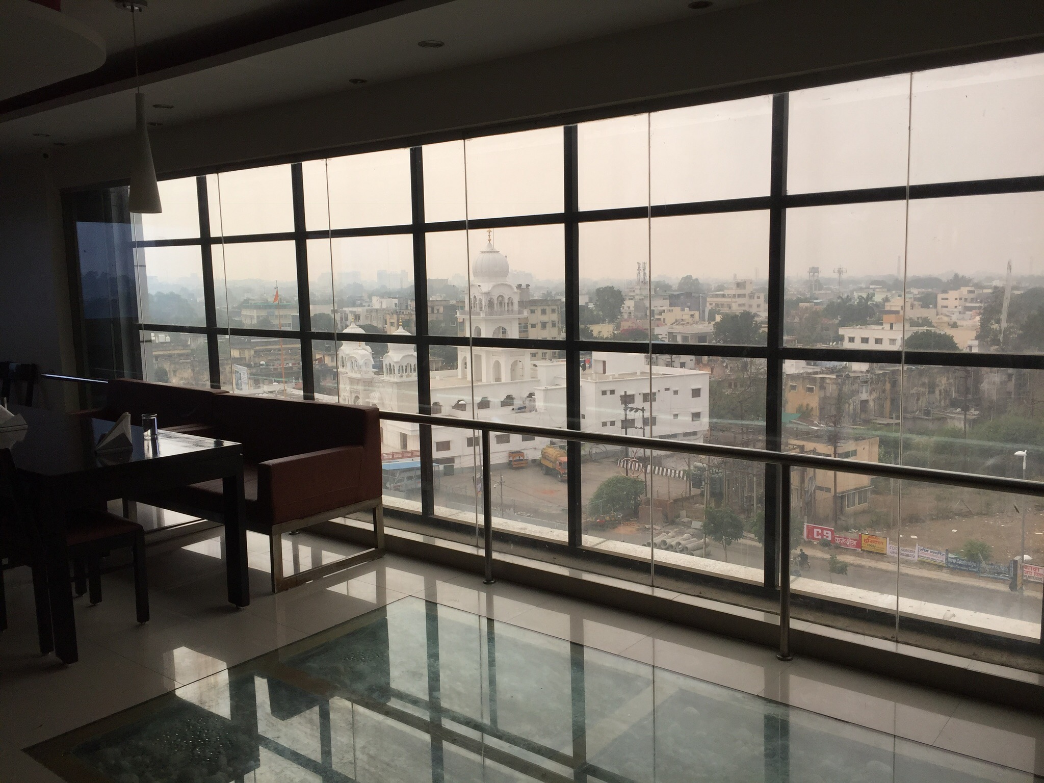 Dit is het uitzicht vanuit het restaurant van het hotel. Aan de overkant van de weg staat een moderne Sikhtempel. Na de lunch (soep met doperwten, overal zitten doperwten in: het soepje bij het ontbijt, de curry, de rijst. Want het is doperwtentijd. Op de markten liggen ze prachtig opgestapeld) ben ik er gaan kijken. De schoenen moesten uit en een sjaaltje lag klaar voor het hoofd. Voordat ik de loper op kon om naar binnen te gaan moest ik door een soort voetenbad stappen. Daar houd ik wel van, schone voeten in de tempel!