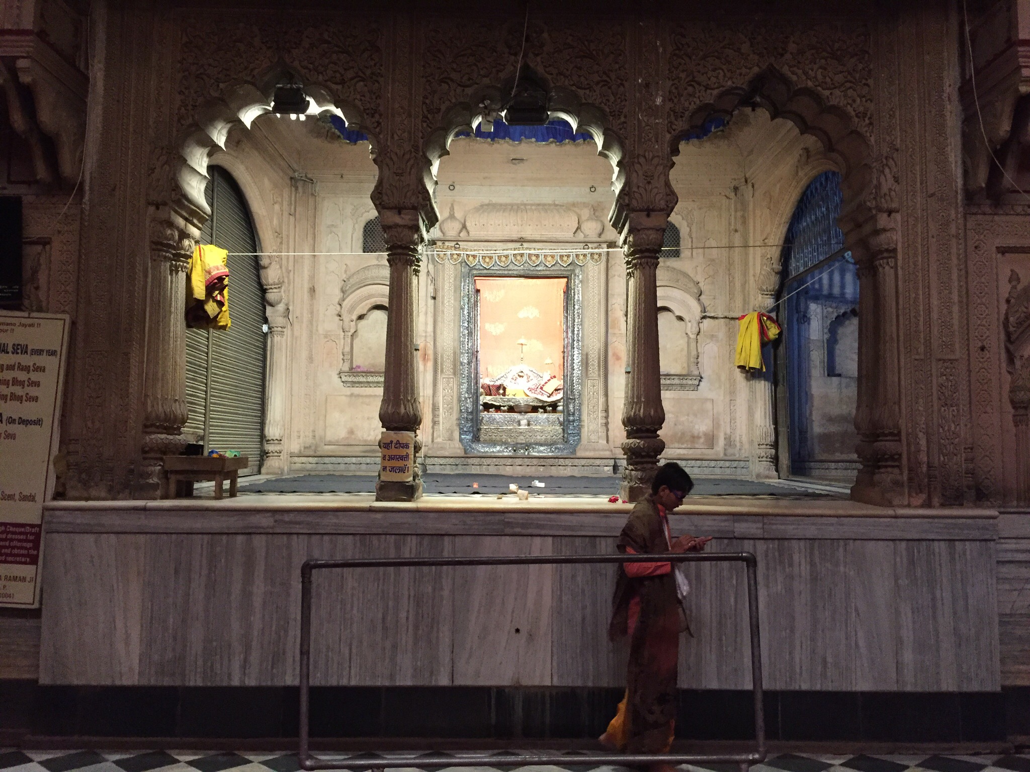 In de tempel, van het allerheiligste (een beeld van Krishna) mogen geen foto’s gemaakt worden. Maar heel in de verte is hij nog te zien. Toen ik met mijn fototoestel dichterbij kwam werd vlug het gordijntje dichtgedaan.