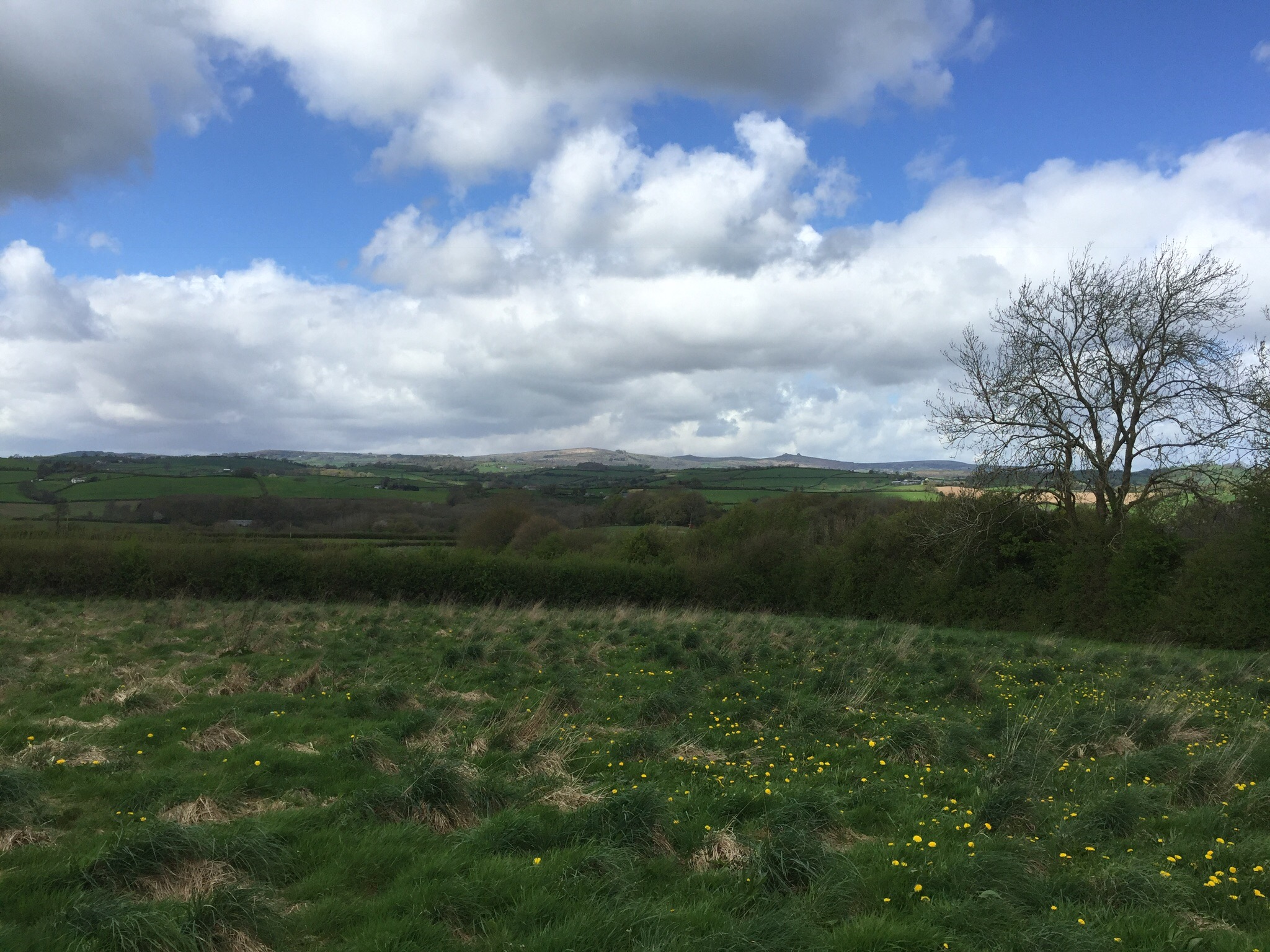 Zicht op de ‘Moors’, een moerasachtig kaal gebied met heuvels, waar iemand willekeurig (lijkt het) enorme keien op heeft gestrooid. Op de rechter heuvel is nog net een enorme kei te zien: Haytor, de grootste kei.
