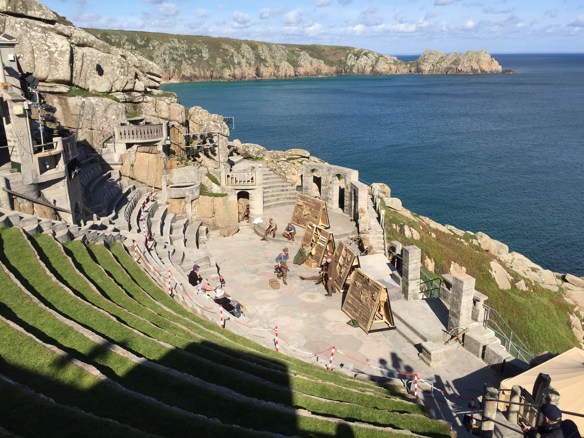 Het pad ging door en kwam uiteindelijk uit in Porthcurno, waar het Minacktheater staat. Aan het begin van de vorige eeuw door een vrouw gebouwd. Er werd gerepeteerd voor een toneelstuk dat speelt in de 1e Wereldoorlog, maar wordt pas over enkele dagen opgevoerd. Ik had het graag willen zien. Maar ja, als alles goed gaat dan ben ik alweer ettelijke mijlen en ervaringen verder.