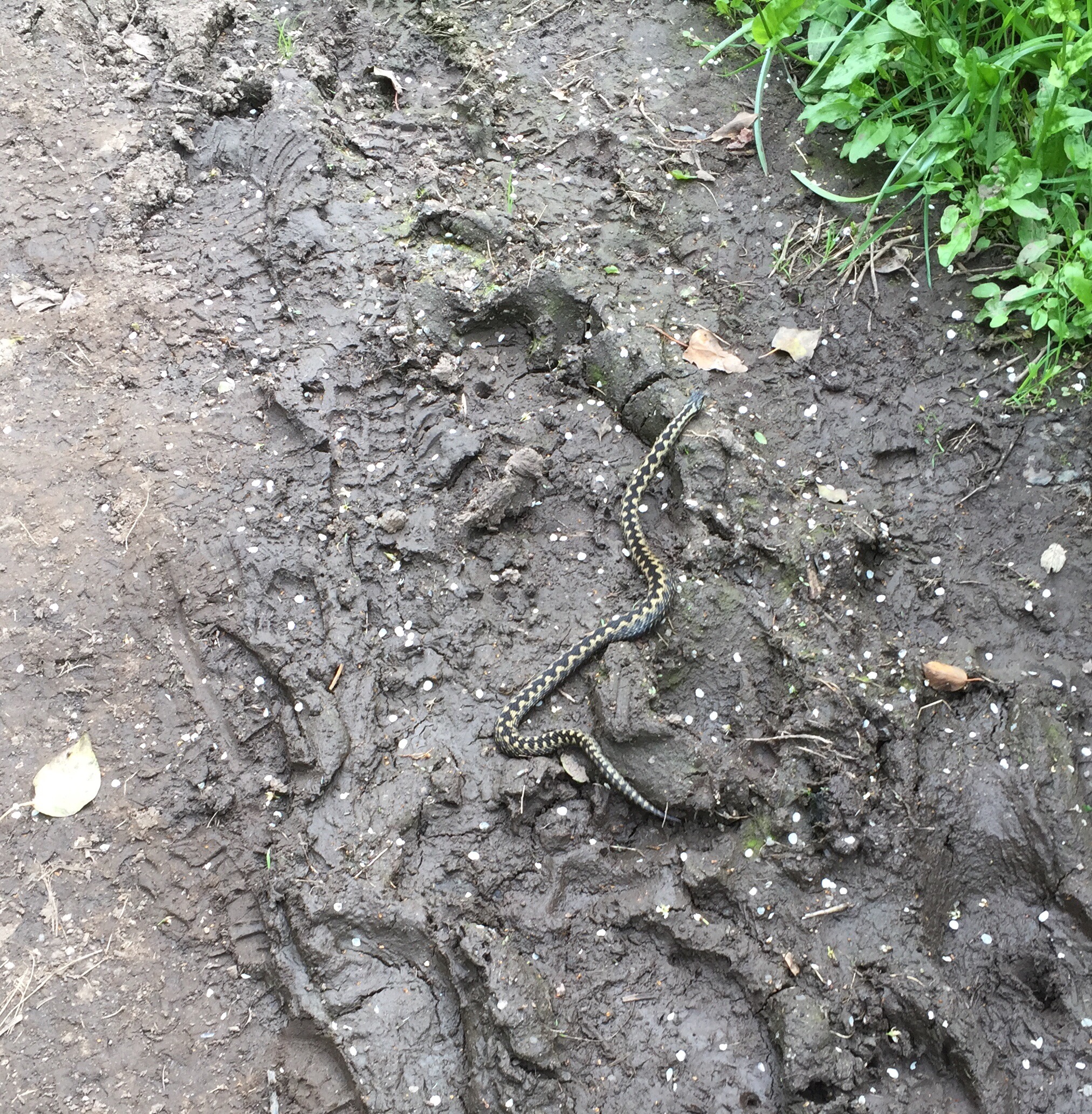 En er lag een slang op het pad (hield ook van de modder) van ongeveer 30 – 40 cm lang, ik kon zijn open kaken met dat tongetje duidelijk zien. Hij was gelukkig ook bang voor mij en verdween snel.