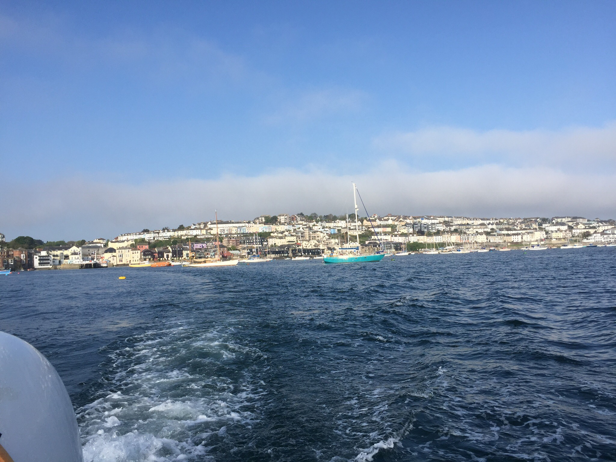 Hier vaart de boot weg van Falmouth, op weg naar Mawes.