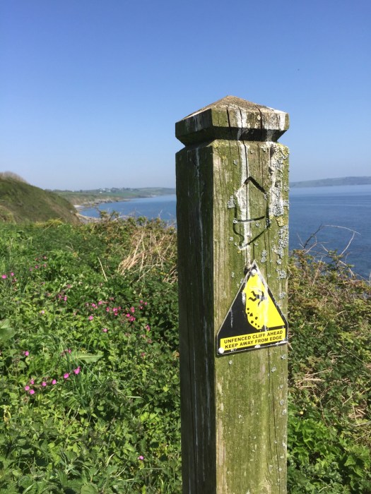 Met regelmatig deze waarschuwing. Het eikeltje is het symbool van het coastpath.
