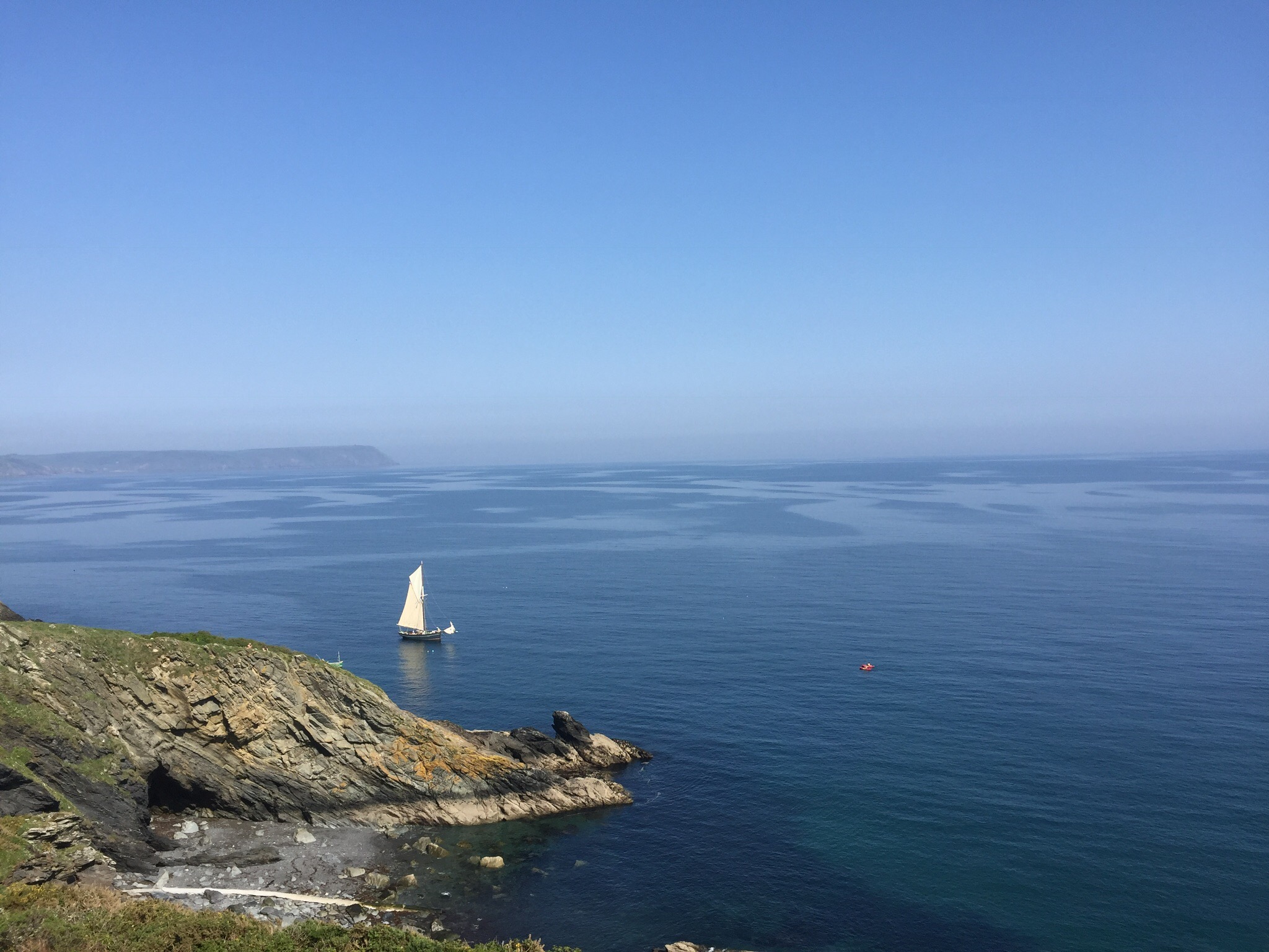 Het ging weer erg lang redelijk begaanbaar, rustig omhoog en omlaag. Ik liep regelmatig langs strandjes waar heerlijk van het mooie weer werd genoten. Toch een beetje raar hoor, met die hoge schoenen en de rugzak tussen de badgasten. Het grote voordeel was wel dat ik zeer regelmatig een beker thee of een flesje water kon kopen. Het was warm vandaag.