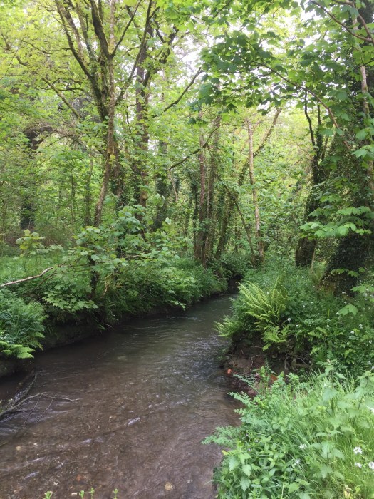 Nu hoopte ik op een bus, want het bleef hard regenen en waaien. De eerstvolgende bus naar Downderry ging over 3 uur, maar een lief oud super Engelse echtpaar ontfermde zich over mij. Ik werd in de eerste bus die aankwam meegenomen en ze bespraken met de chauffeuse waar ik eruit moest, bij het dal waar het riviertje de Derry, doorstroomde. Ik moest het riviertje volgen en kwam dan automatisch weer bij het kustpad uit. Dat zou ik dan nog 2 mijl moeten volgen en dan was ik er. Ik had inmiddels de regenbroek ook aan en begon aan de wandeling. Deze foto is gemaakt toen het even niet regende. Een prachtig klein dal met een rivier.