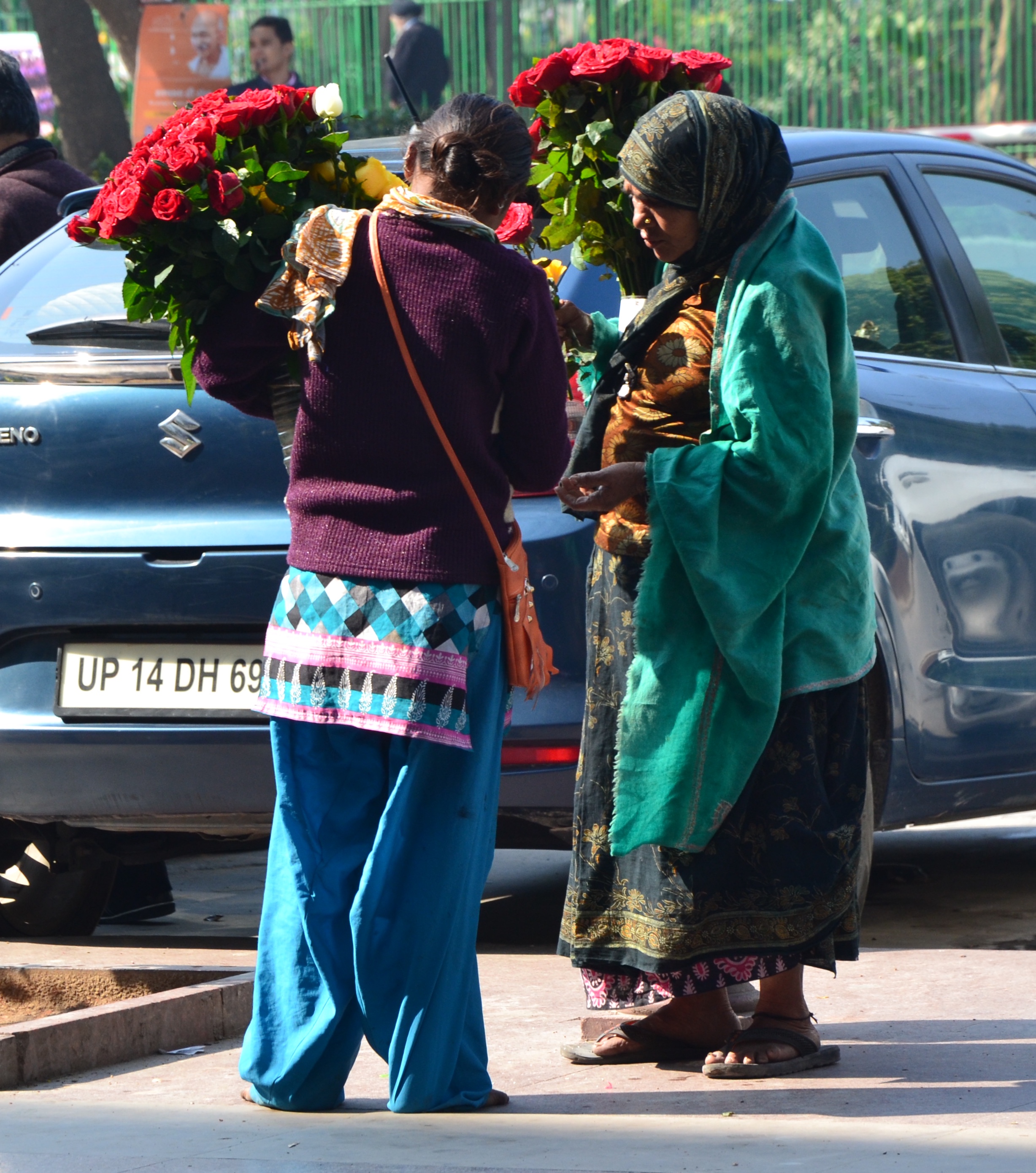 Daar werd ik ook door een Zweedse man aangesproken die vroeg of ik met hem meeging met een stadstour, hij had een taxi geregeld. Dit leek me wat veel deze dag, een hele dag auto in, auto uit. Ik wilde naar buiten, lekker lopen, dwars door de jetlag heen. Het hotel ligt aan de rand van de oude stad. Op weg naar het ‘nieuwe’ Delhi en de musea werd het een wandeling door een stad vol tegenstellingen. De mannen achter hun typmachine voor het kantoor van een advocaat en de yup die daar langs loopt via zijn oordopjes luisterend naar de iphone. De vrouwen die met hun handen het vuil van de straat moeten opvegen voor de winkel van H&M die ‘sale’ heeft.