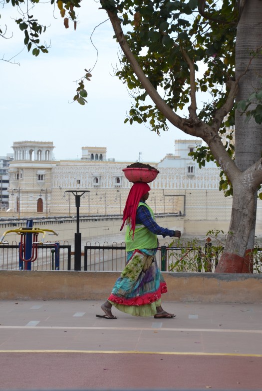 Ondertussen liep zij de hele tijd voorbij, heen met een schaal koeienmest, terug met een lege schaal. Ze hoorde bij een groep vrouwen die de promenade schoon hielden (en schoon was hij).