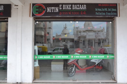 Onderweg een winkel waar e-bikes te koop zijn! E-bikes in India? Ik moet er niet aan denken. Maar Pollution Free Drive!