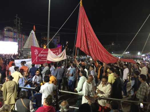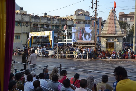Aan de andere kant van de straat stond een groot scherm opgesteld, waar de Indiase Jeroen Pauw gesprekken hield met verschillende mensen. Afgewisseld met beelden van saddhu’s die zenuwachtig stonden te wachten.