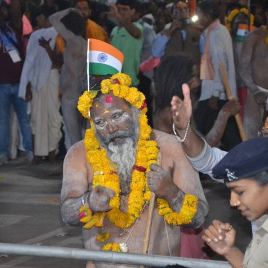 Om half 8 begon de parade: een explosie van energie. De stoet werd aangevoerd door de zgn ‘vechtsaddhu’s’ die met stokken een soort gevecht dansten. Ook enkele vrouwelijke saddhu’s deden hieraan mee.