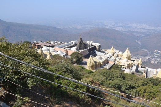 De tempels van bovenaf gezien, beneden aan de voet van de heuvel ligt het feestgebied, achter de heuvel ‘aan de overkant’ ligt Junagadh.
