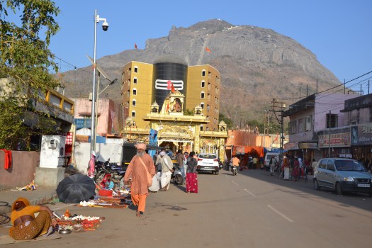 Dit is de het hoogtepunt van gisteren: de Bhavnath tempel met op de achtergrond het doel van vandaag: de berg Girnar, bezaaid met Jain – en Hindoetempels. (de zwarte plastic lingam met de witte strepen van Shiva, achter de tempel was vanmiddag ook al weer weg).