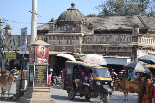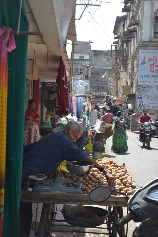 In Palitana veel gewandeld op zoek naar haar intrinsic motivation (als je op het punt komt dat je denkt: hier is niets aan, dan blijkt er toch wel weer iets in elke stad te zijn). Maar ik ben bang dat er hier sinds de onafhankelijkheid weinig veranderd is. Veel, heel veel jonge mannen op straat (dus veel werkeloosheid), bedelaars, kleine straathandel en vergane Willincdon glorie. Er stond nog een overdekte groentemarkthal en een bibliotheek van hem.