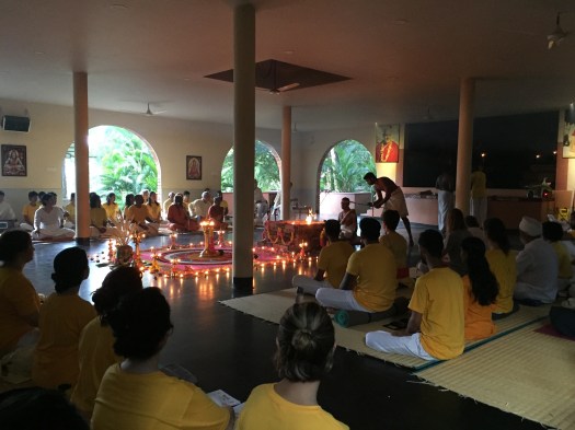 Om 11 uur is er karma-yoga: het dienen van de gemeenschap zonder gehechtheid en zonder eigen belang. Bij aankomst krijgt ieder een taak. Ik kreeg als taak ervoor te zorgen dat er altijd bij alle groepen een doos met kleine, opgevouwen doekjes stond waarmee de mat kon worden schoongemaakt.
