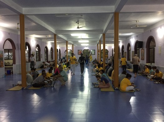 Deze les duurt tot 10 uur, gevolgd door de brunch (het is niet goed te yoga-en met volle maag). De (Indiase) maaltijden bestaan uit rijst of roti, peulvruchten, groentes, een sausje en een kruidendrank. (En geen ‘opwekkende’ middelen zoals scherpe kruiden, gember, knoflook of ui). Het eten wordt op een bord met vakjes opgediend en moet dan gezeten in lotushouding met de handen worden opgegeten. Die houding was al een probleem voor mijn knieen en dan nog met die handen….. het werd het een knoeiboel, maar ik had gelukkig een lepel in de bagage.