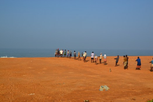 Het net wordt door de mannen het land opgetrokken. Gelukkig gaan de boten met een traktor het land op.