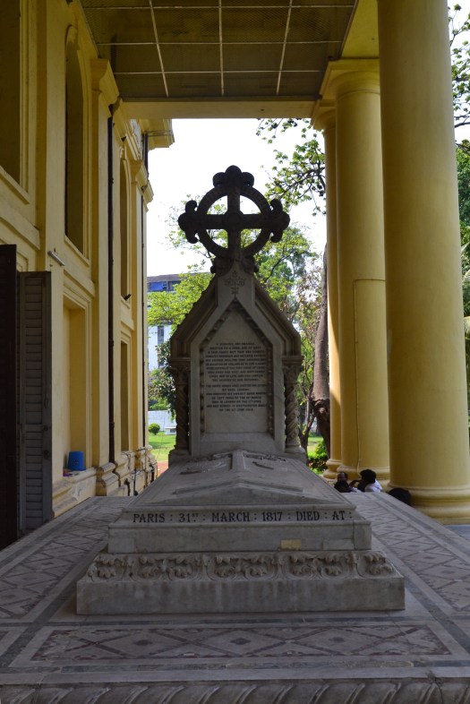 Dit is het grafmonument van ‘de beroemde’ Rose Aylmer (nog nooit van gehoord). De dichter Walter Savage (ook beroemd maar mij ook onbekend) schreef een prachtig (de engelse reisgids is een beetje chauvinistisch) gedicht over haar en dit gedicht staat op het monument (maar is onleesbaar). Rose stierf aan een overdosis ananas……. en het monument lijkt op de vorm van een ananas (zoals men die in India schilt). Het monument is geadopteerd door de turnvereniging uit Kolkata.