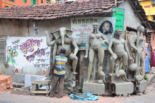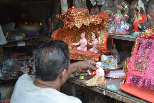 Deze man werkt aan een beeld van Parvati (de vrouw van Shiva). Binnenkort wordt hier het Parvatifestival gevierd en in de wijk Kumartali, de wijk van de beeldenbouwers, wordt volop aan (veel) beelden van haar gewerkt.