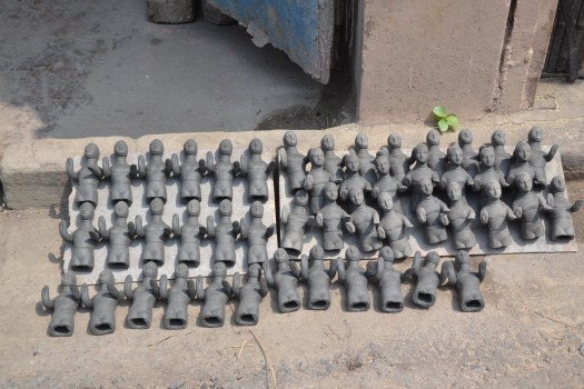 Eerst wordt het geraamte van stro gemaakt en daarom heen wordt met klei uit de rivier het lichaam verder geboetseerd.
