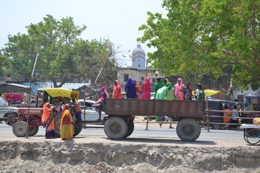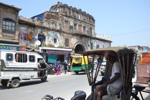 Hier rijden er nog taxis. Het auto’tje links rijdt op en neer naar Faizabad. Voor 20 rsp heb je een plaats. Als de taxi vol is zitten er 8 mensen in plus 2 bij de chauffeur. En dan hebben ze ook nog veel bagage en kinderen op schoot, allemaal in die auto. (Ter vergelijking, ga je in je eentje met de tuktuk dan kost het ritje 200 rsp. De fiets-riksha is weer goedkoper, maar zo’n man 8 km laten fietsen in de hitte……).