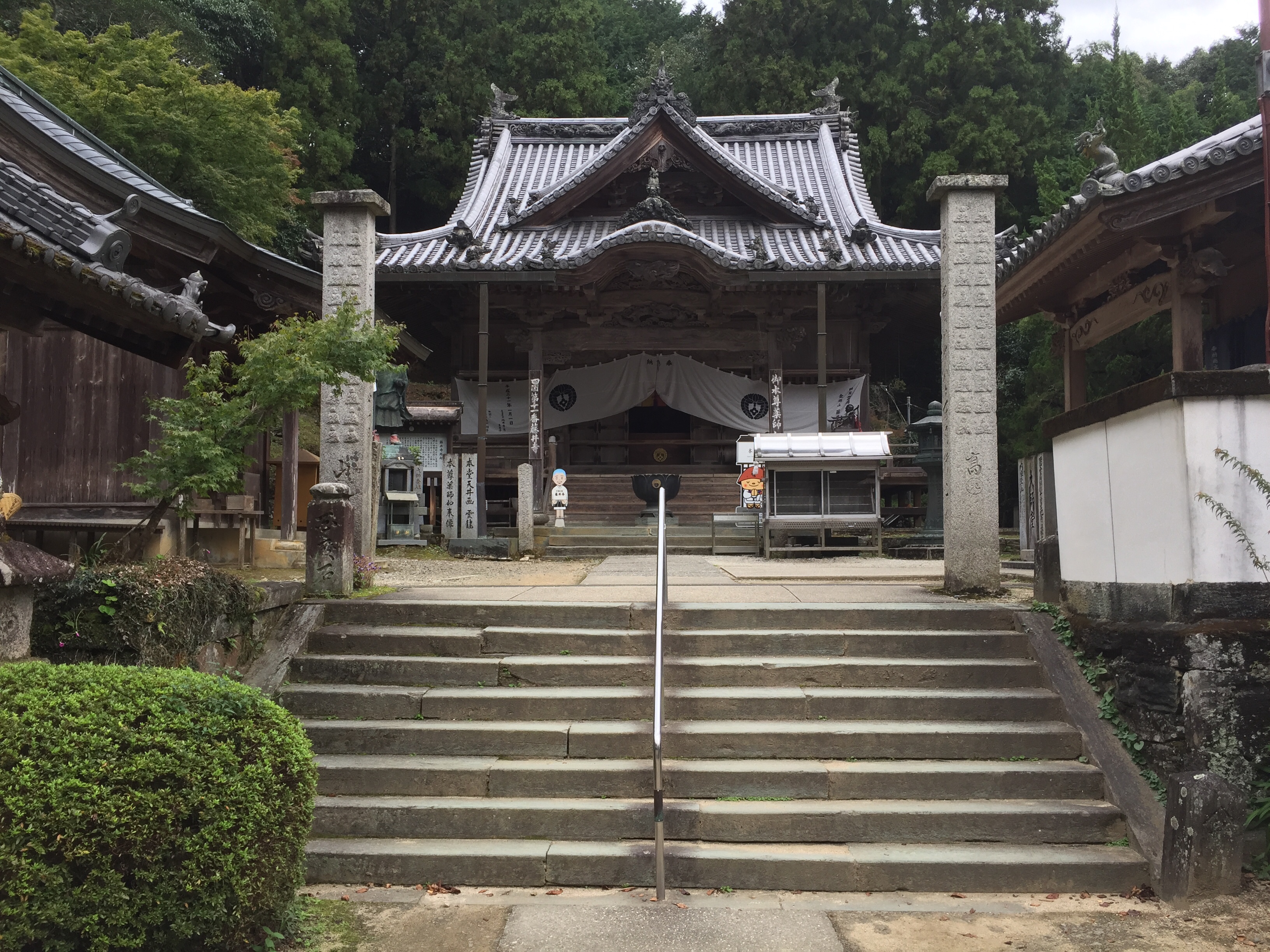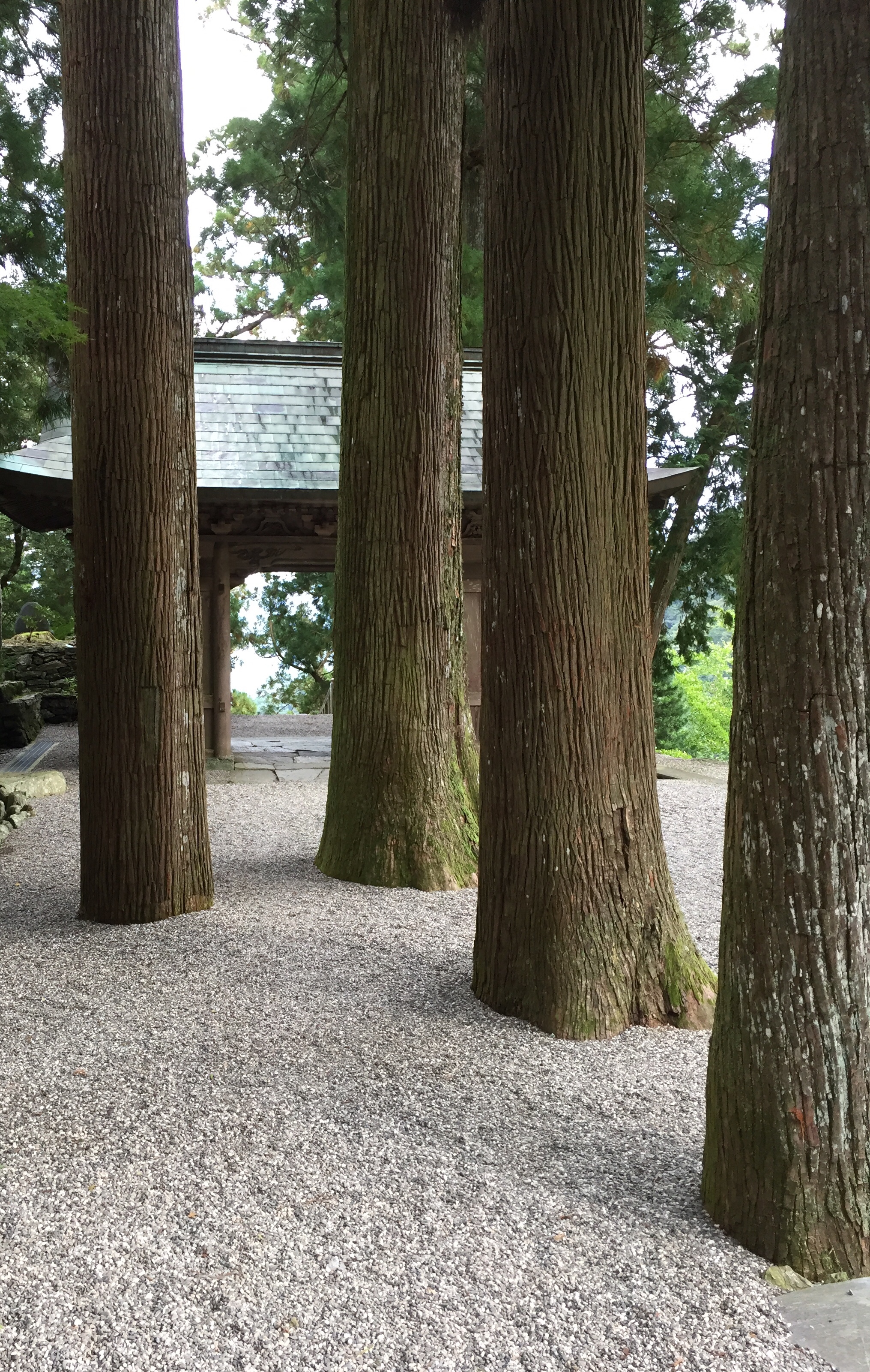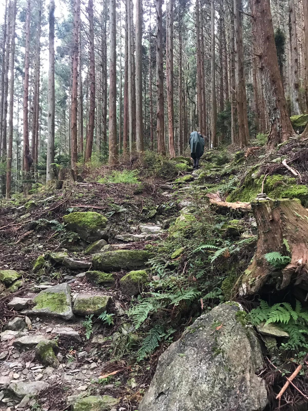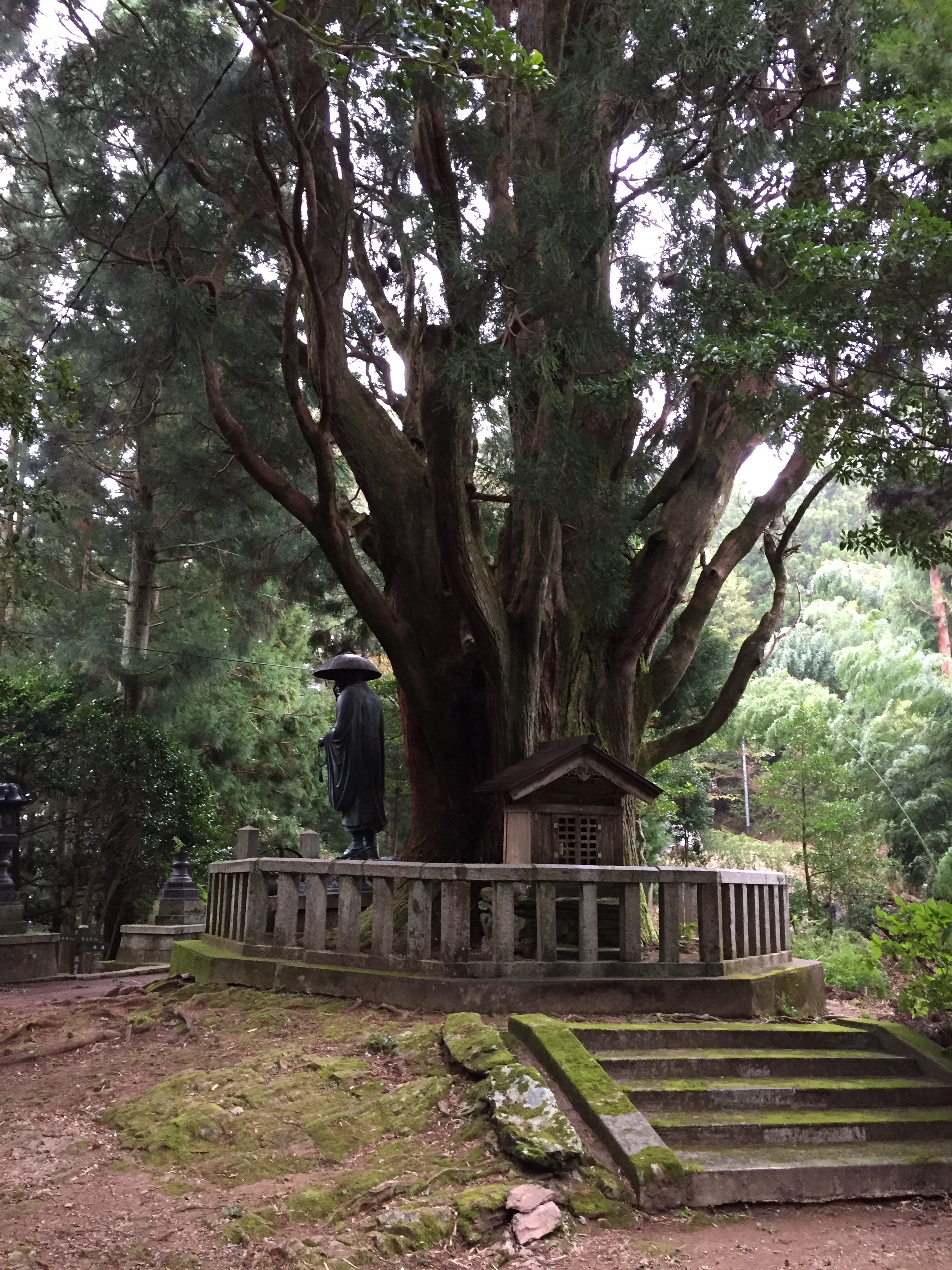 Maar het was zwaar, er waren stukken van het pad weggespoeld en we liepen over grote stukken steen die door de regen glad werden. Ook waren de boomwortels glad. Onderweg stonden er weer beeldige beeldjes van Jizo of een standbeeld van Kobo Daishi.