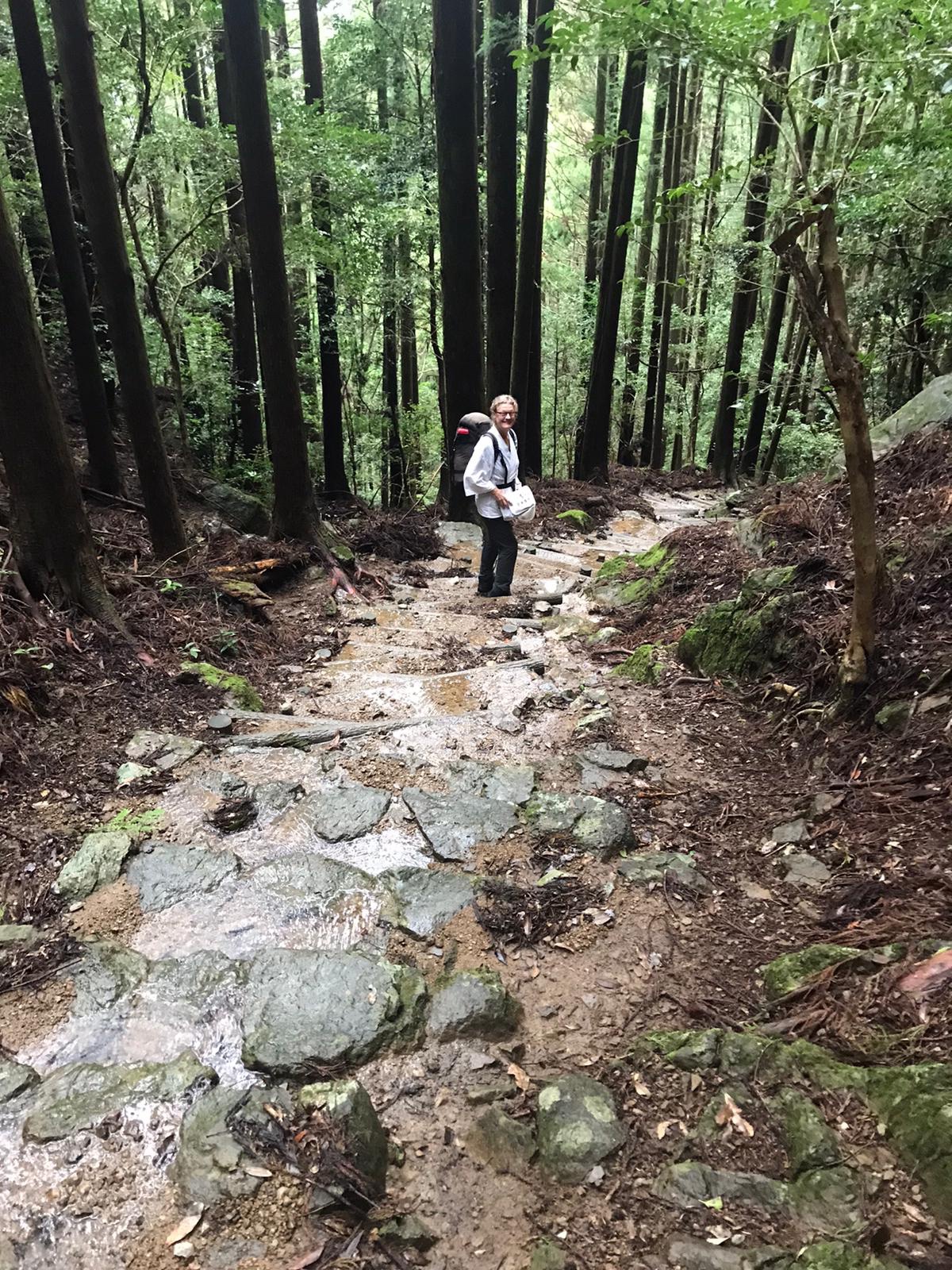 Bij de tempel aangekomen brak de zon door. Na nog een stuk glibberend klimmen kwamen we bij de grot waar Kobo Daishi gemediteerd zou hebben…….