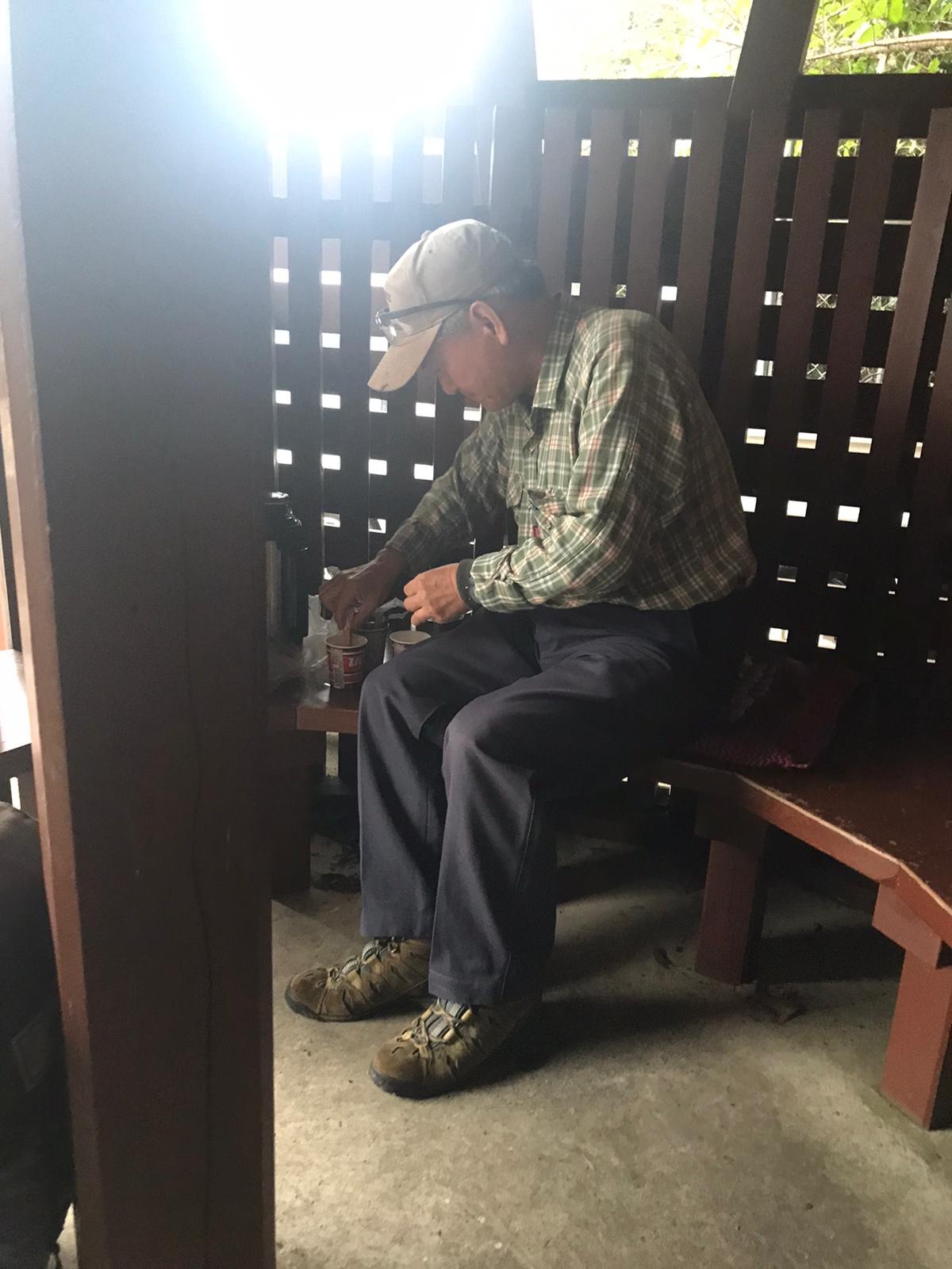 Toen we hierna de bocht omgingen en een pauze namen in een henro hut, zat daar de man weer met warme koffie!