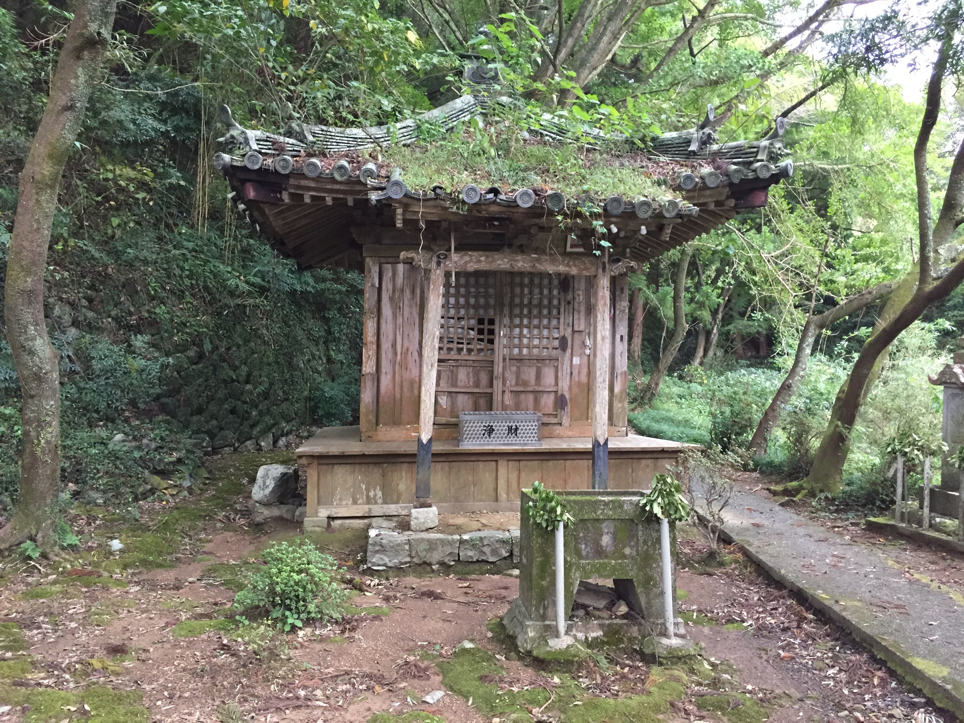Daarna passeerden we een Shinto tempeltje, het staat op de plek waar Kukai ook een wonder heeft verricht: hij stampte met zijn staf op de grond en er ontstond spontaan een bron. (sindsdien? Water genoeg hier, het regent inmiddels weer pijpenstelen)