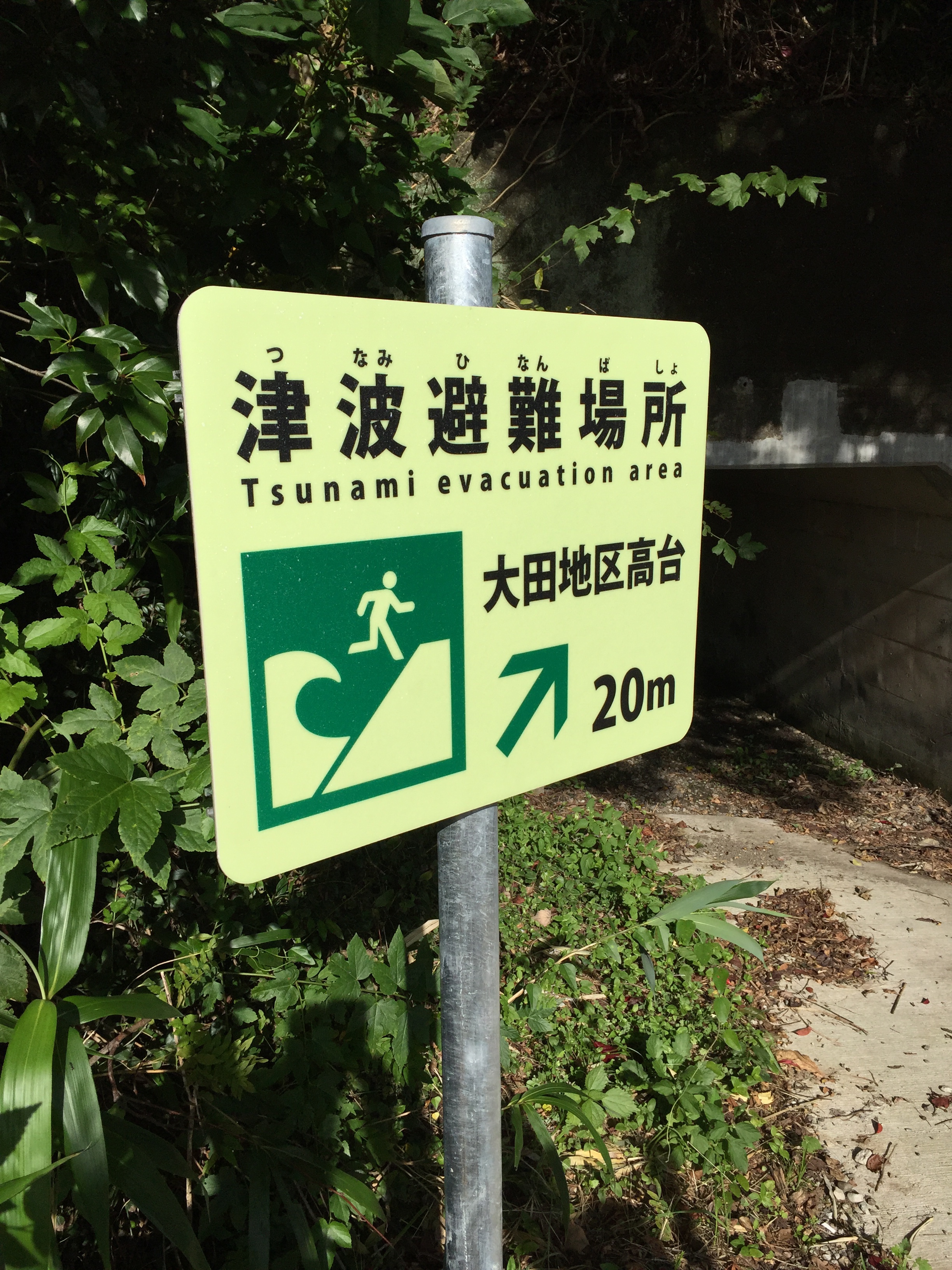 Dit gebied ligt in de gevarenzone van de tsunami en overal staan waarschuwingsborden en wordt het aantal meters boven de zeespiegel aangegeven.