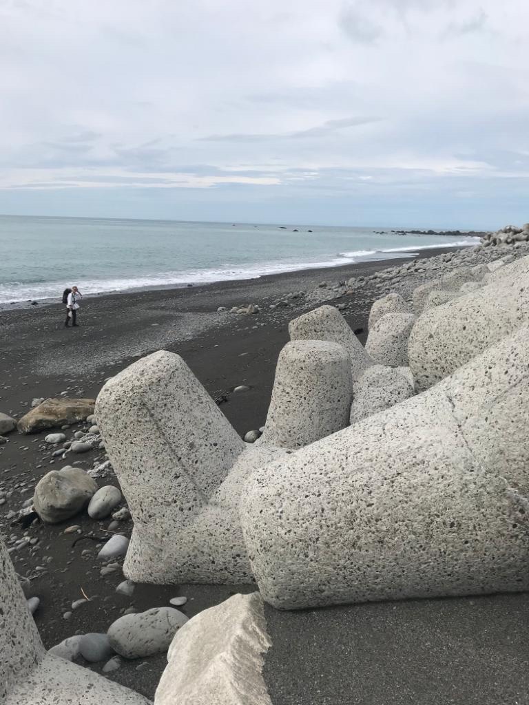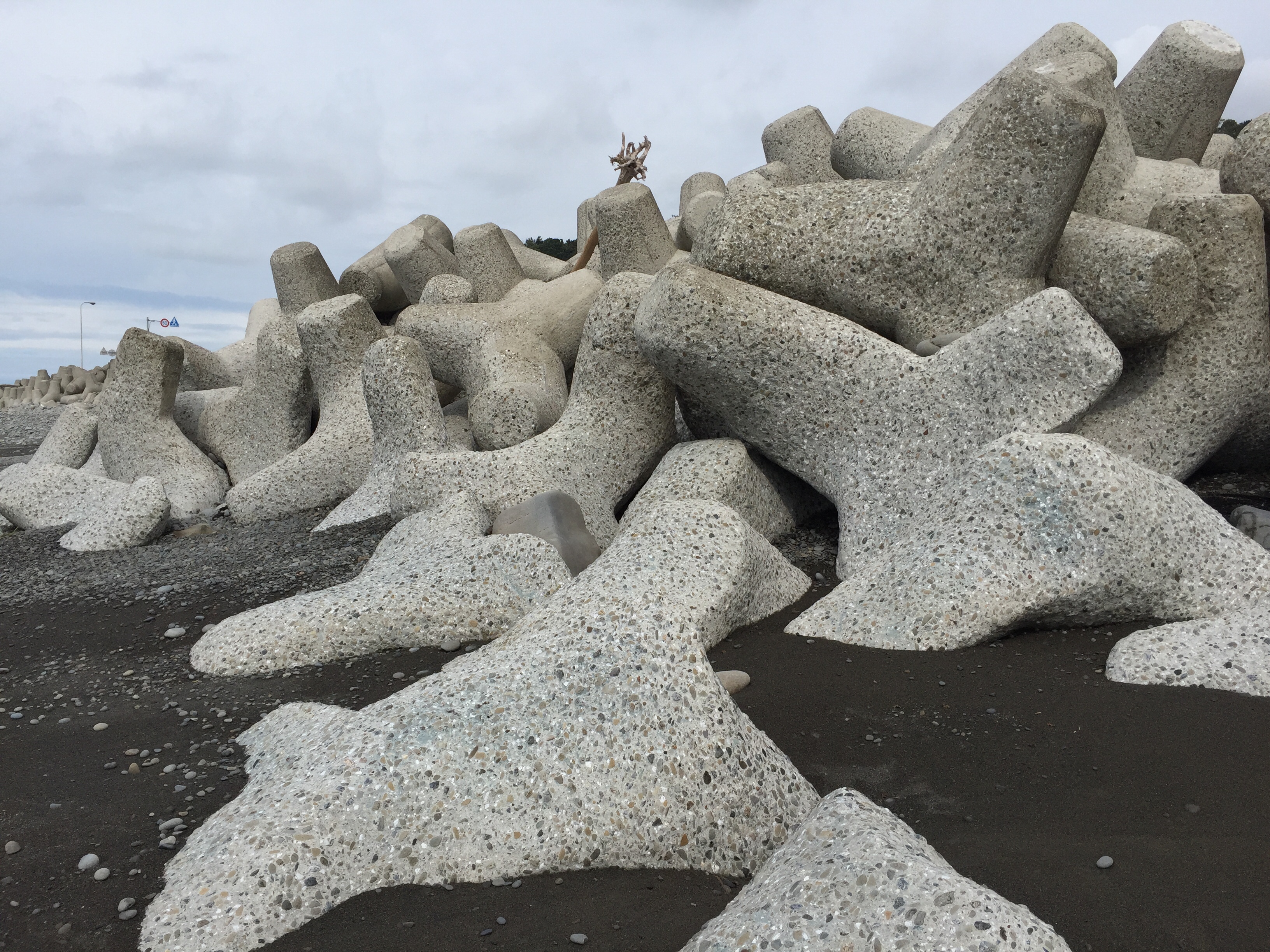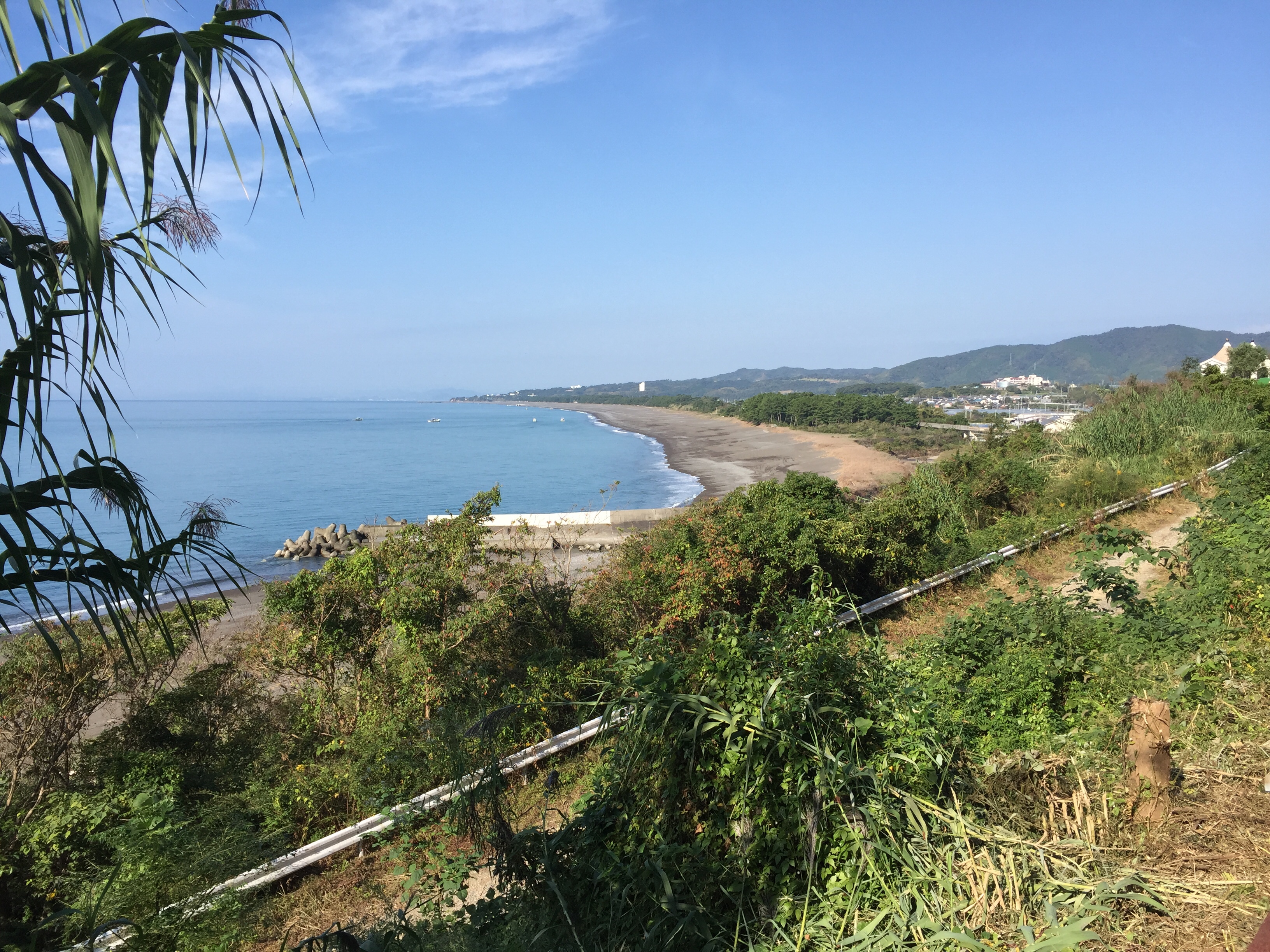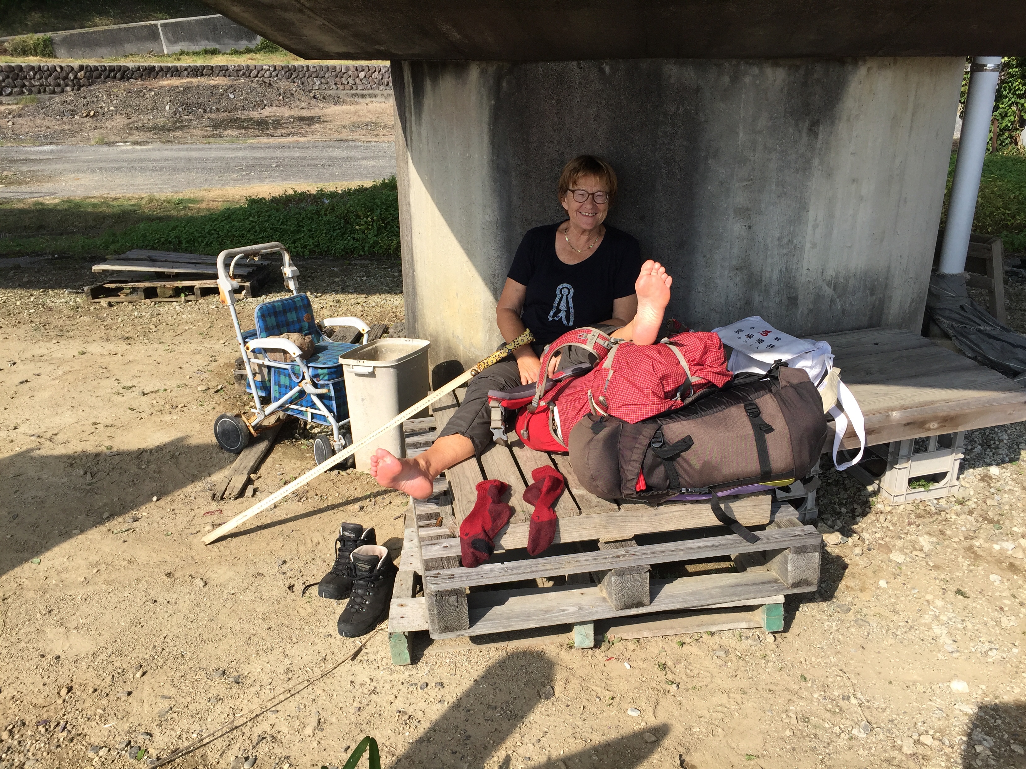 We liepen ook een groot stuk door een recreatiegebied, met vakantiehuisjes, toiletten (overal staan toiletten in Japan en allemaal schoon), en kampeerplaatsen. Er zat nu nog een eenzame man te vissen en er stopte een auto waarvan de bestuurder naar de wc moest. Badplaats buiten het seizoen……gelukkig was het mooi weer.