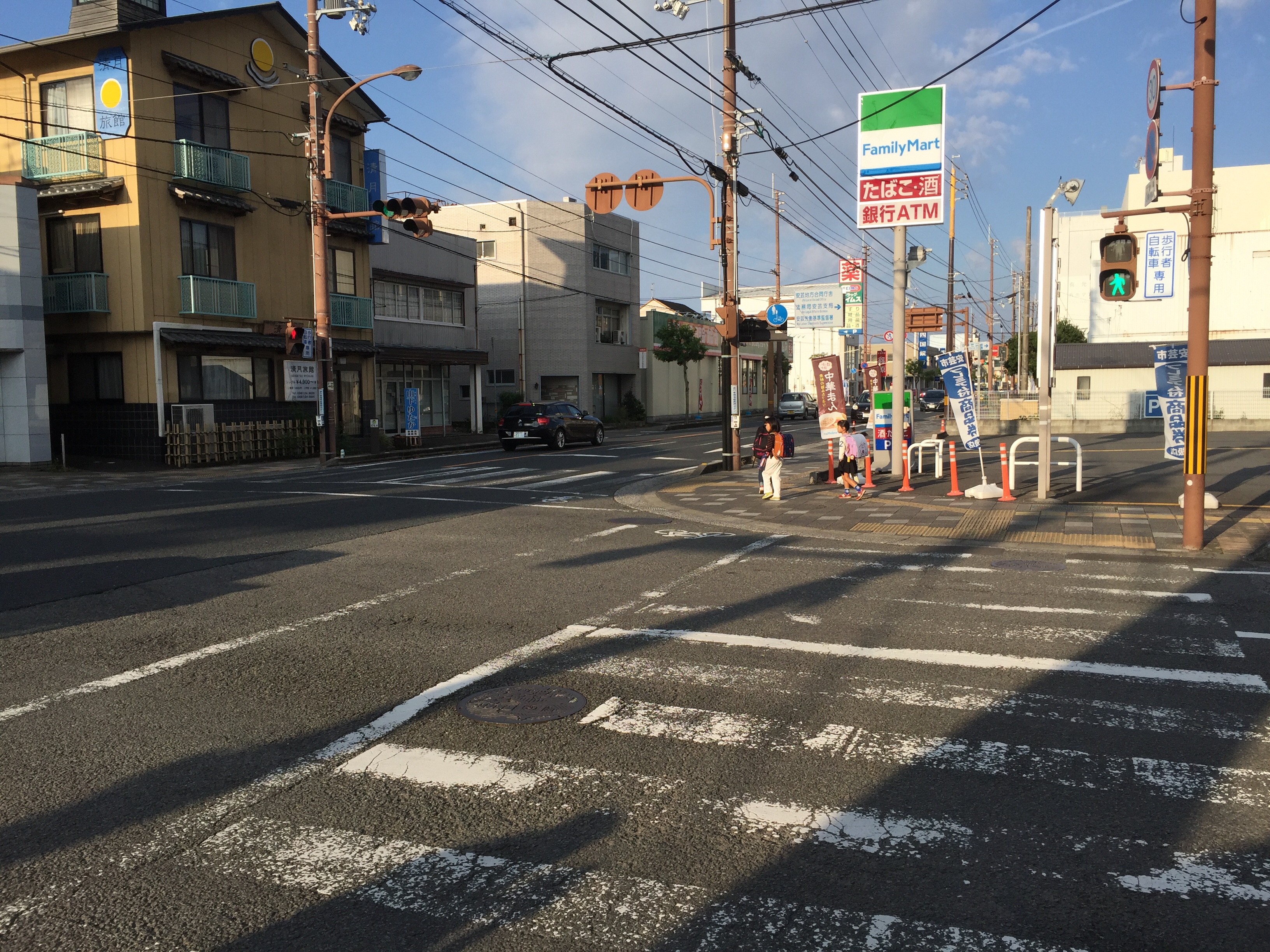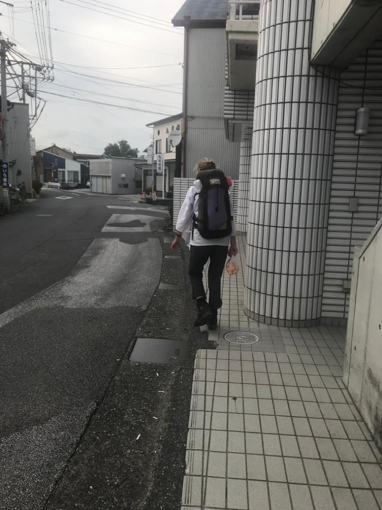 Hier loop ik met een zak mandarijntjes, die kregen we van een passerende vrouw die met een sprint uit een auto op ons afkwam. Ze wees ons ook nog de weg. Even later kwam ze terug, duizenden excuses, ze had ons de verkeerde weg gewezen. Dat gaf allemaal niets want ik zag het al: het volgende witte gebouw (met de letters) is de ryokan van vannacht. De mandarijntjes zijn inmiddels op.