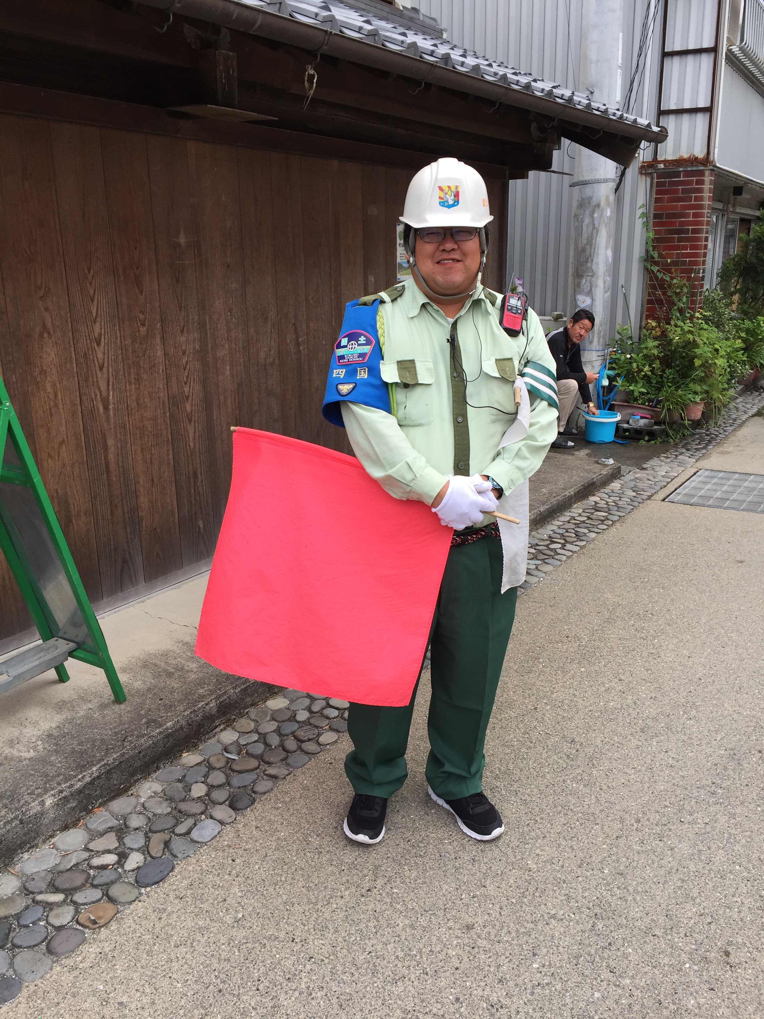 Verderop in de straat werd gewerkt. Het verkeer (auto’s, fietsen en wandelaars) wordt dan altijd door mannen met vlaggen geregeld.