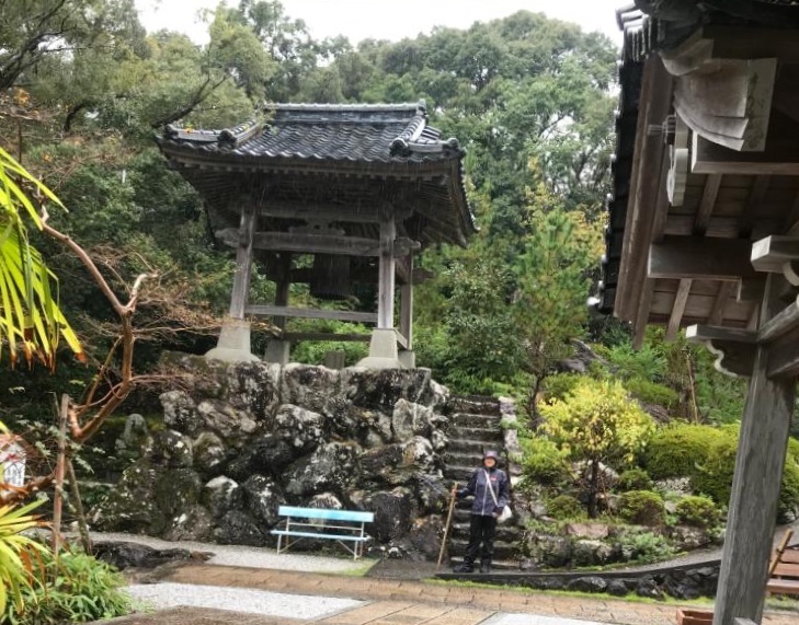 De pelgrim draagt altijd een Kongozue (een stok). Hierop staat dezelfde tekst en vaak nog de Hartsutra (hierover later meer). De stok heeft een brocade hoesje waaraan een belletje zit dat tijdens het lopen continue rinkelt, om zo de aandacht telkens weer naar het heden, naar de werkelijkheid ‘terug’ te trekken.