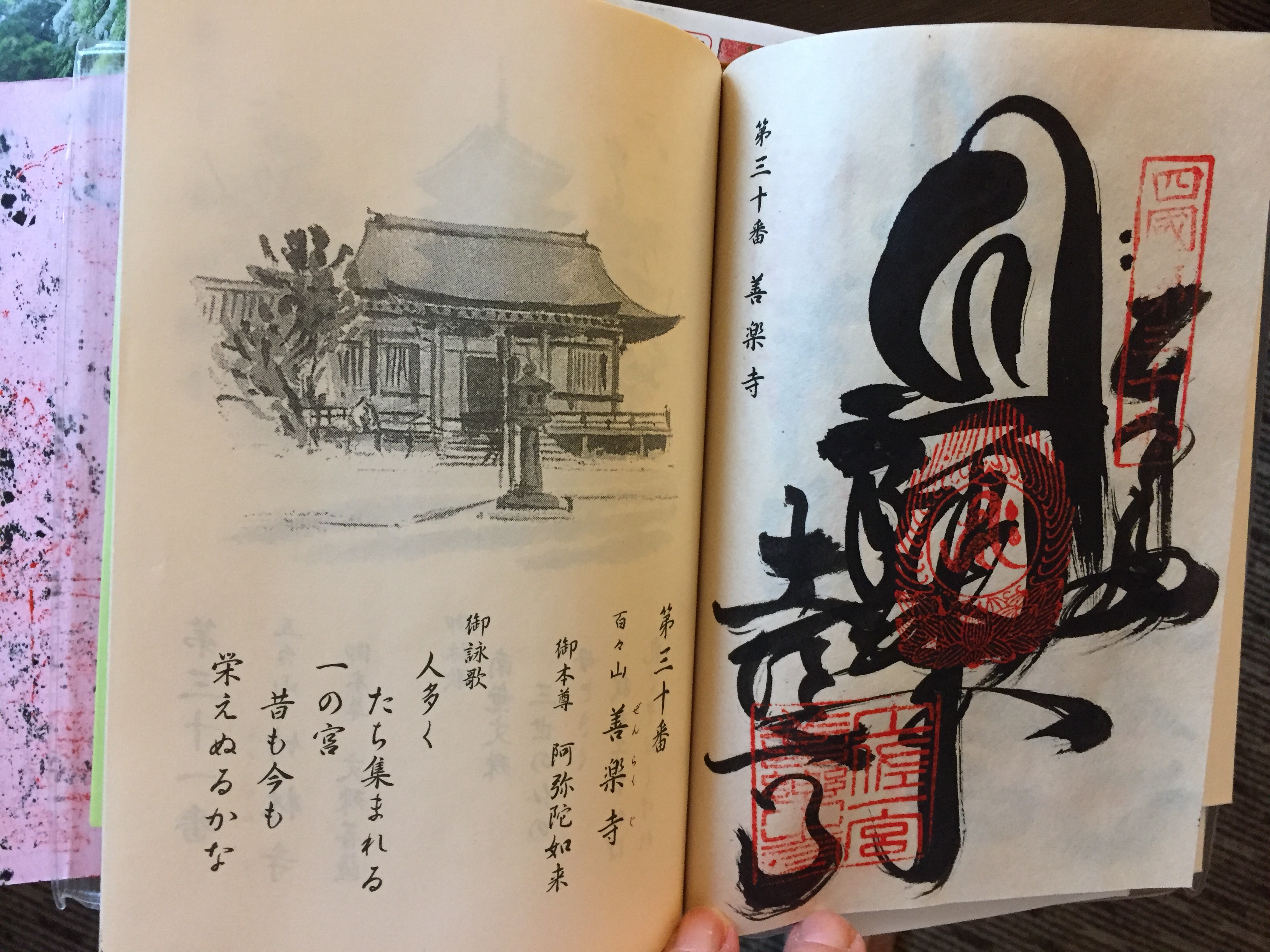 Het stempelboek bestaat uit telkens een bladzijde met een afbeelding van de tempel en daarnaast speciaal papier waarop 2 of 3 stempels worden gezet. Daarbij worden de datum en de naam van de hoofdheilige van die tempel gekaligrafeerd.