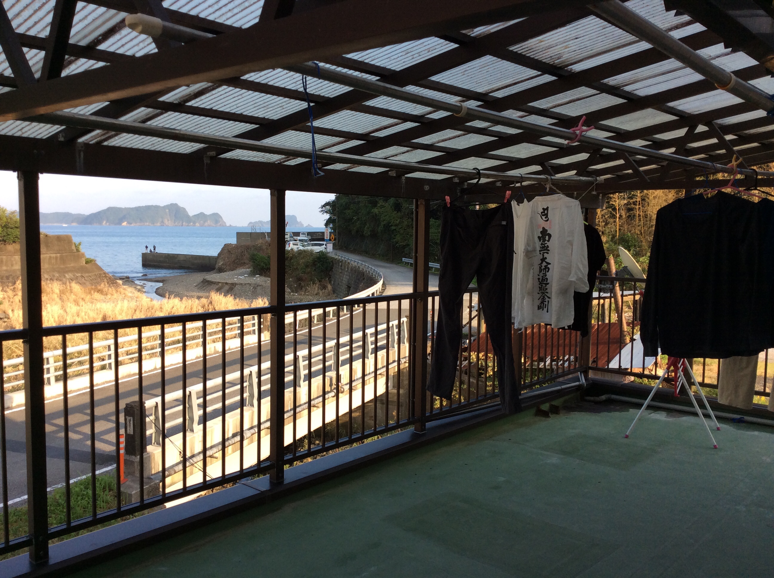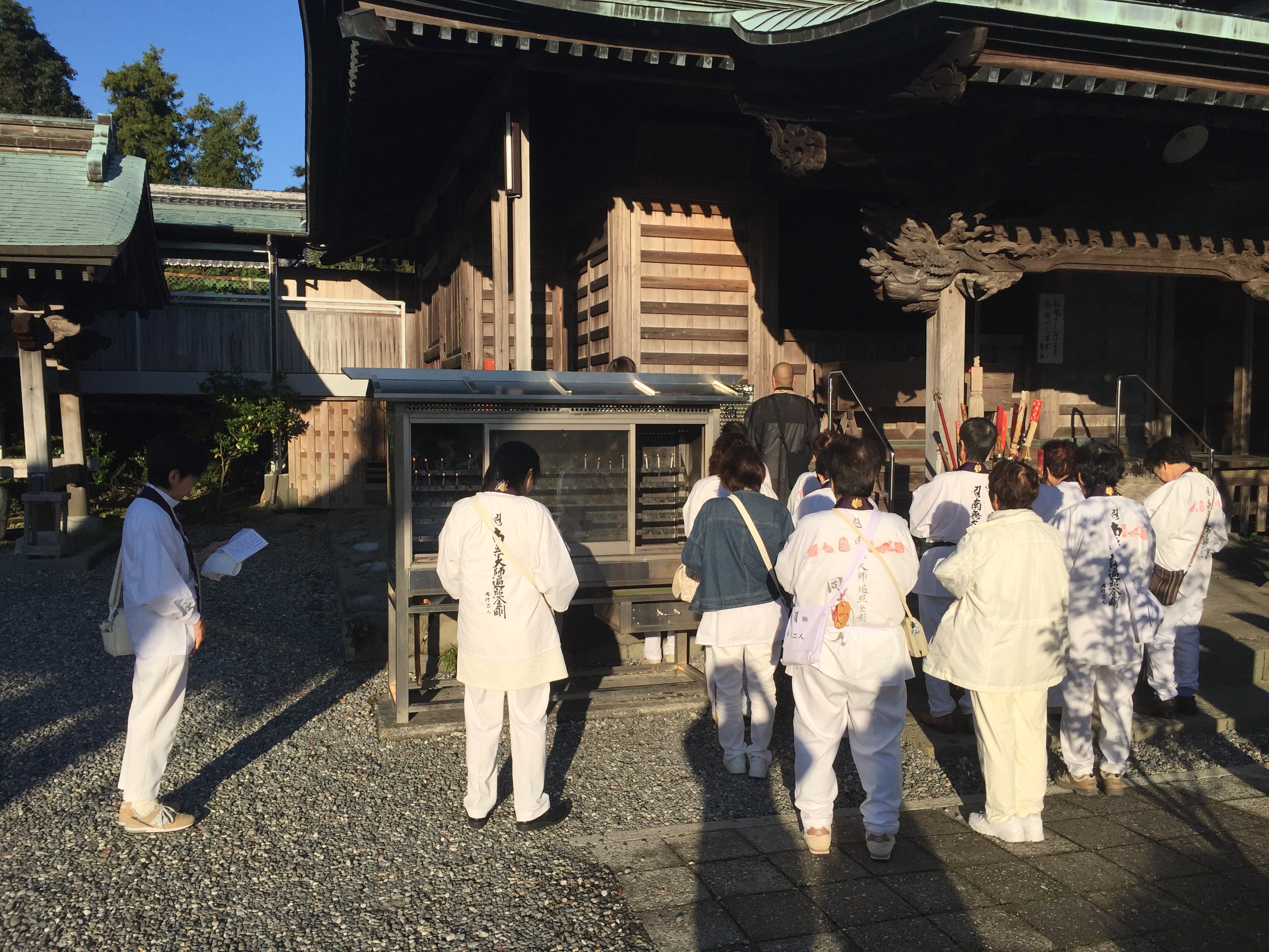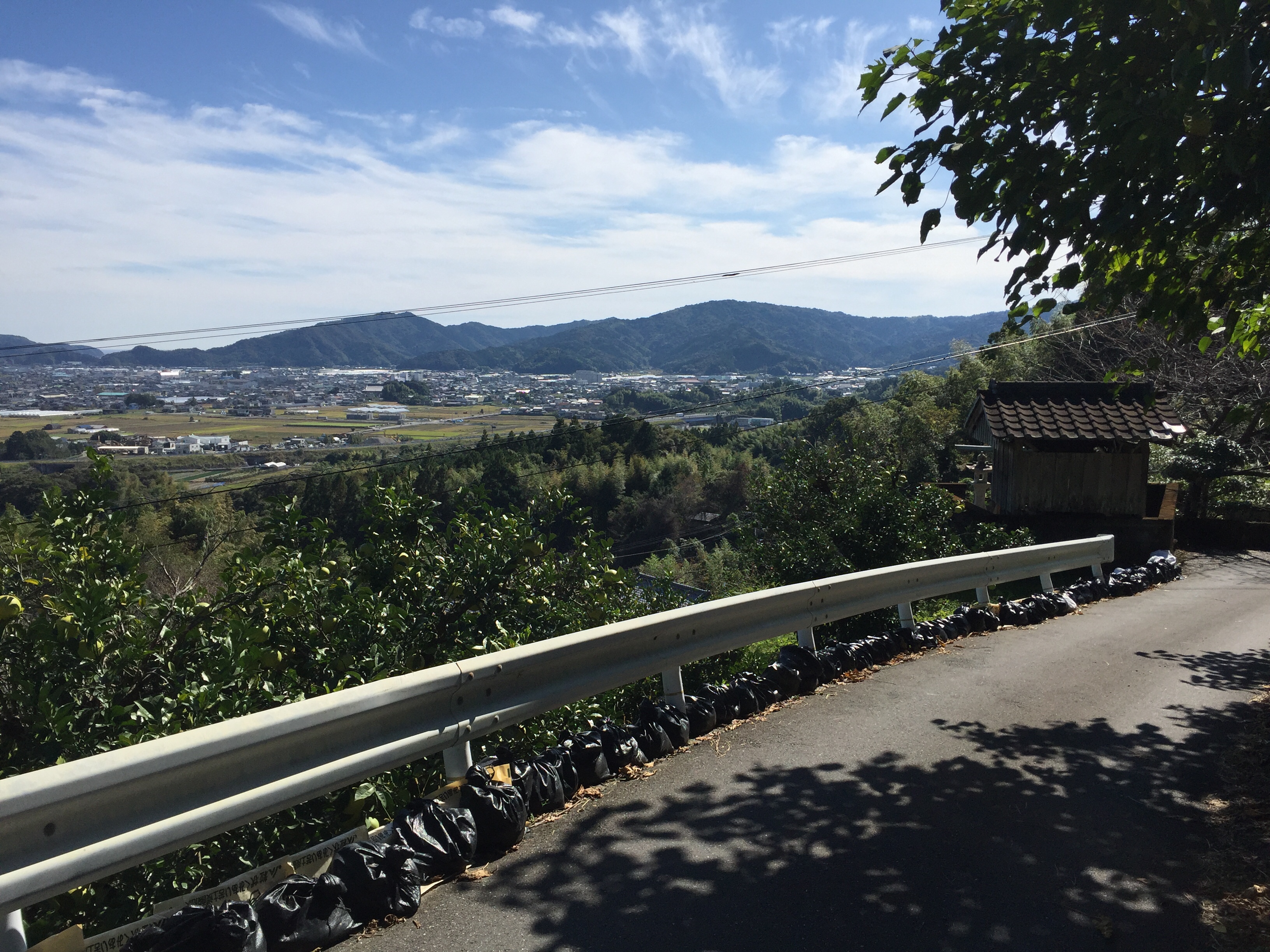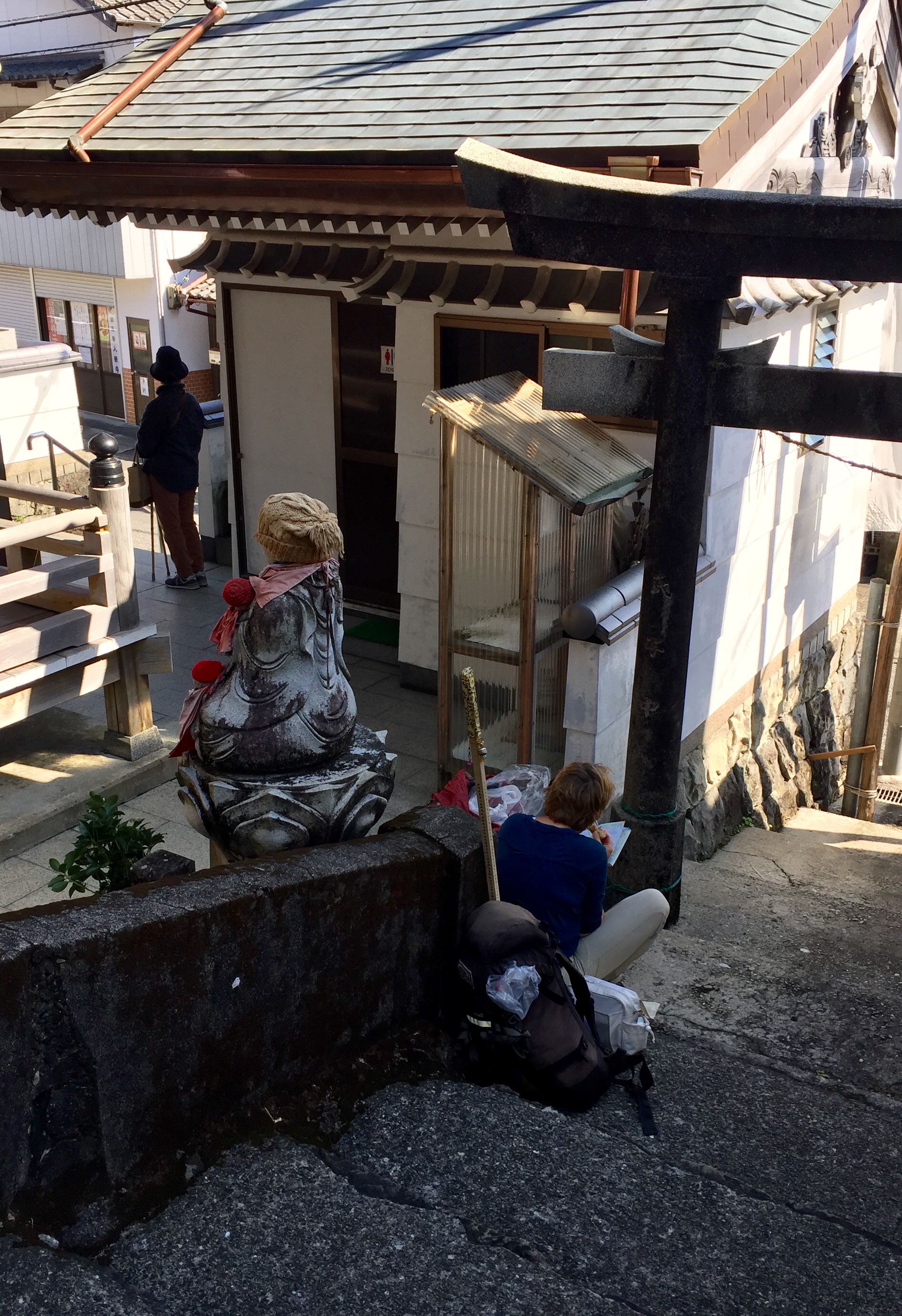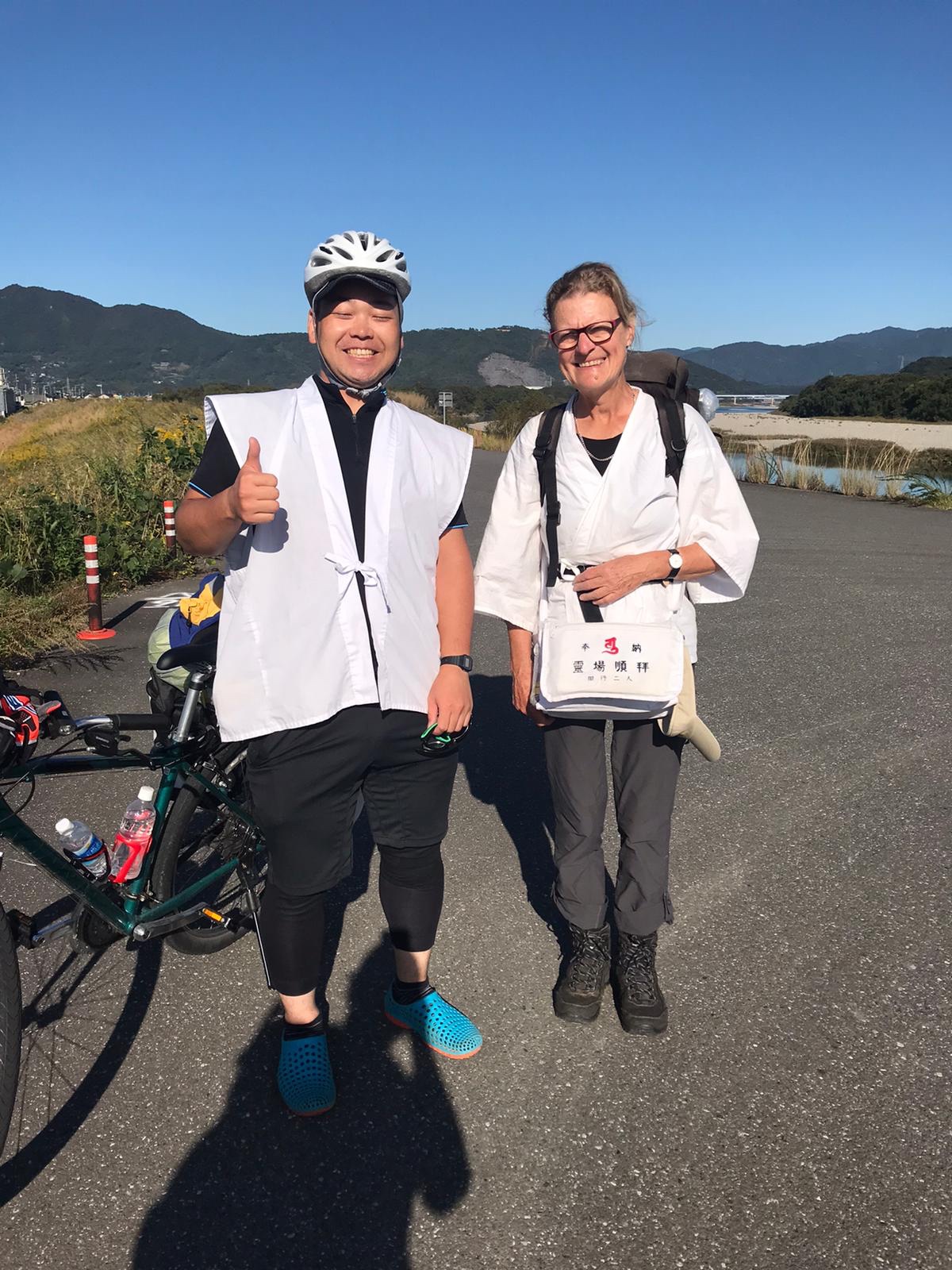 Het was een jonge man die even met ons mede-henro’s wilde praten en natuurlijk ook met ons op de foto wilde. We kregen een soort chocolade reep van hem. Ik gaf een mandarijntje terug. ( we hadden gisteren twee enorme zakken fruit van iemand gekregen, een zak mandarijntjes en een zak kaki-fruit. Van dit laatste kon ik nog net 2 stuks uithalen en de rest terug geven).